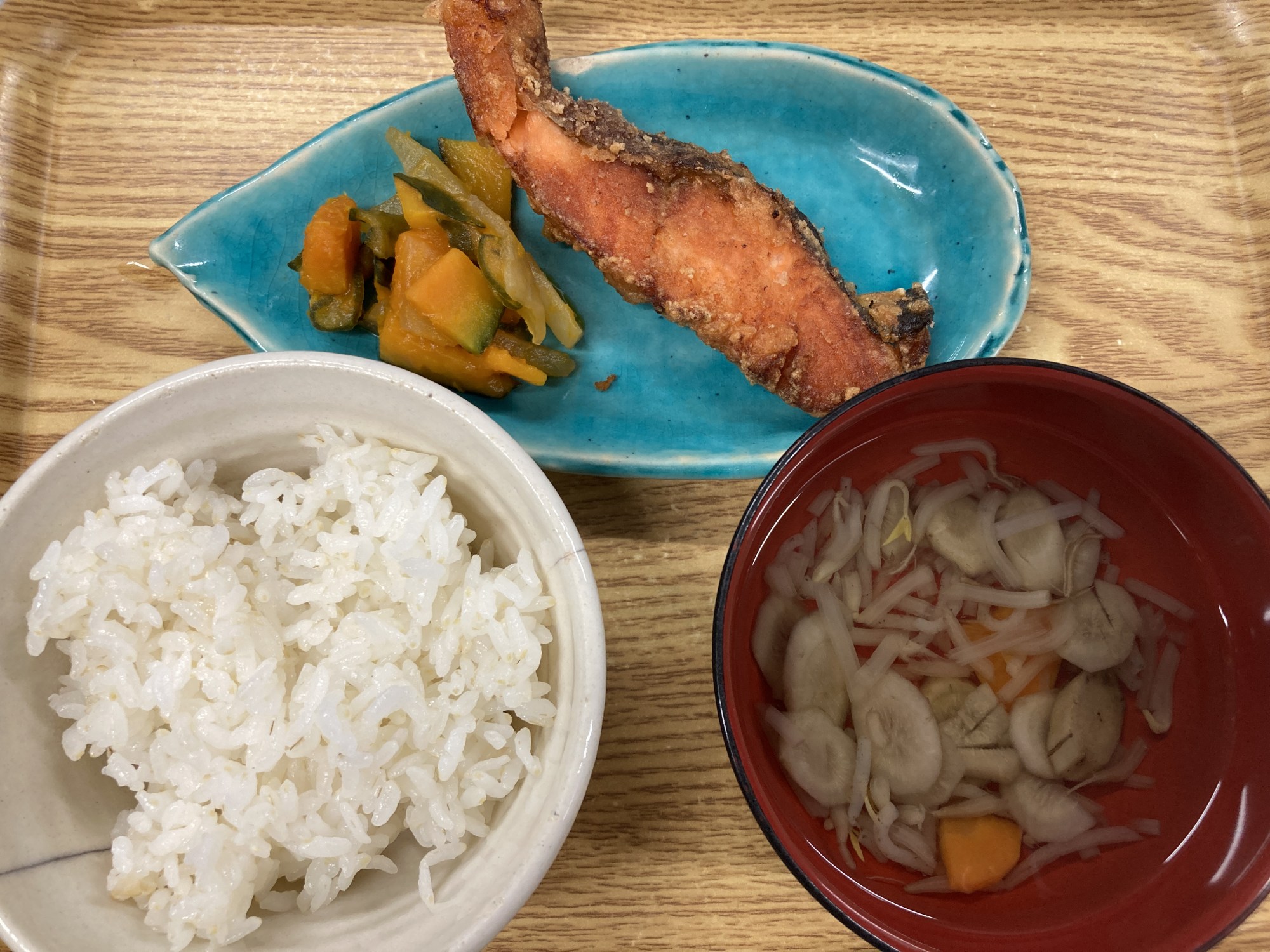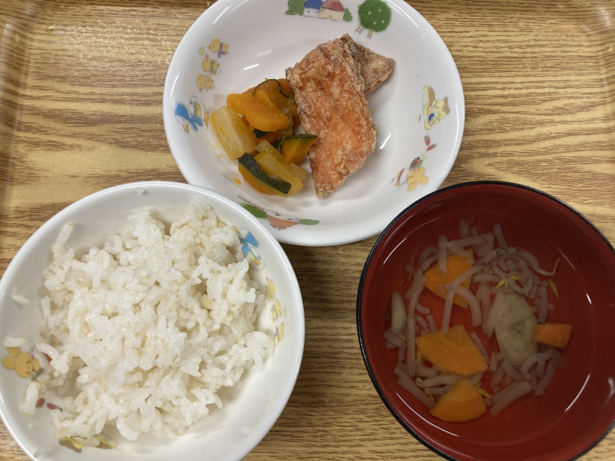 1枚目:【普通食:以上児】サケの唐揚げ・南瓜の和え物・ごぼうのお吸い物
