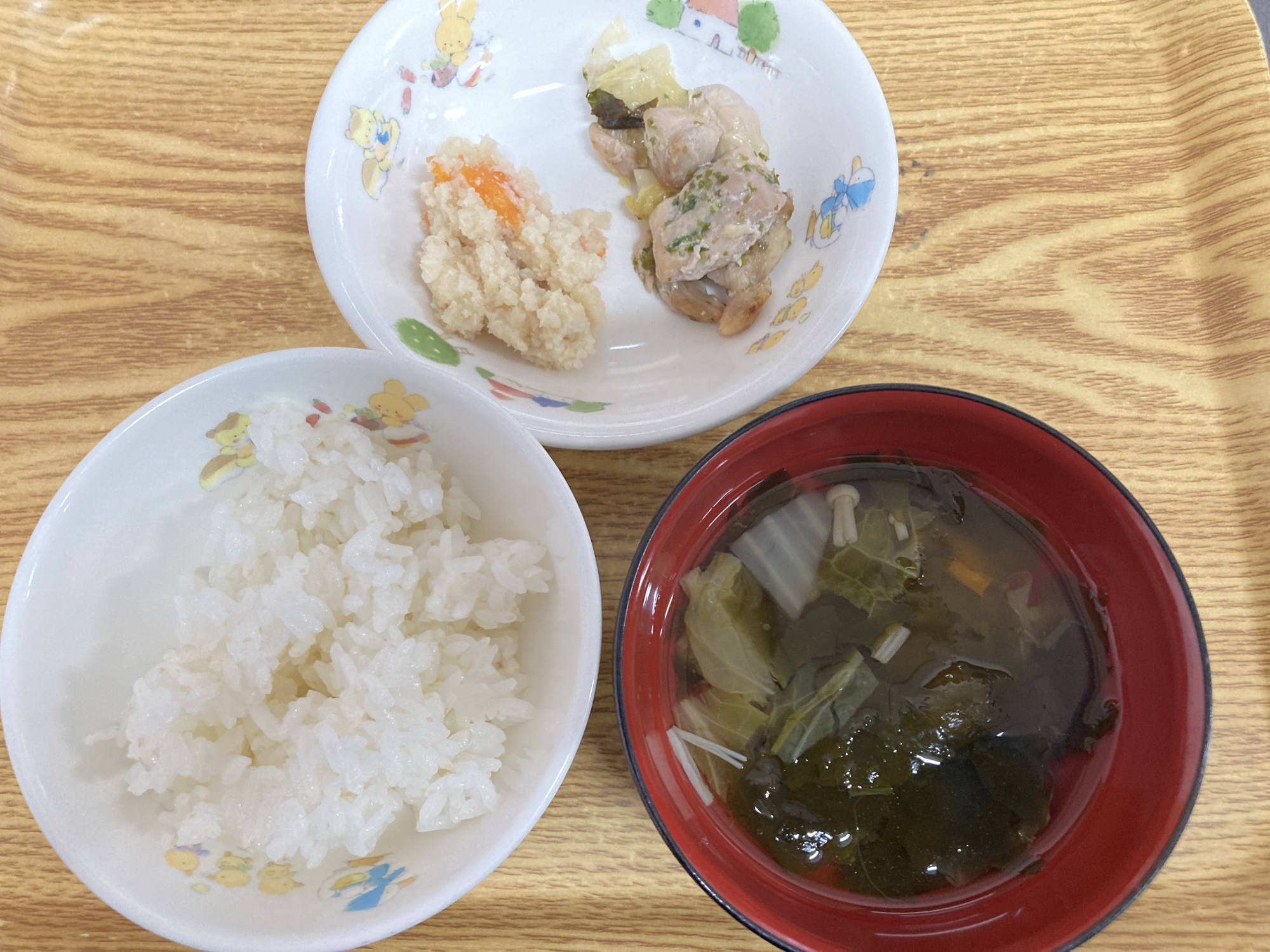 1枚目:【普通食:以上児】鶏肉の青のり焼き・卯の花の炒り煮・わかめのお吸い物