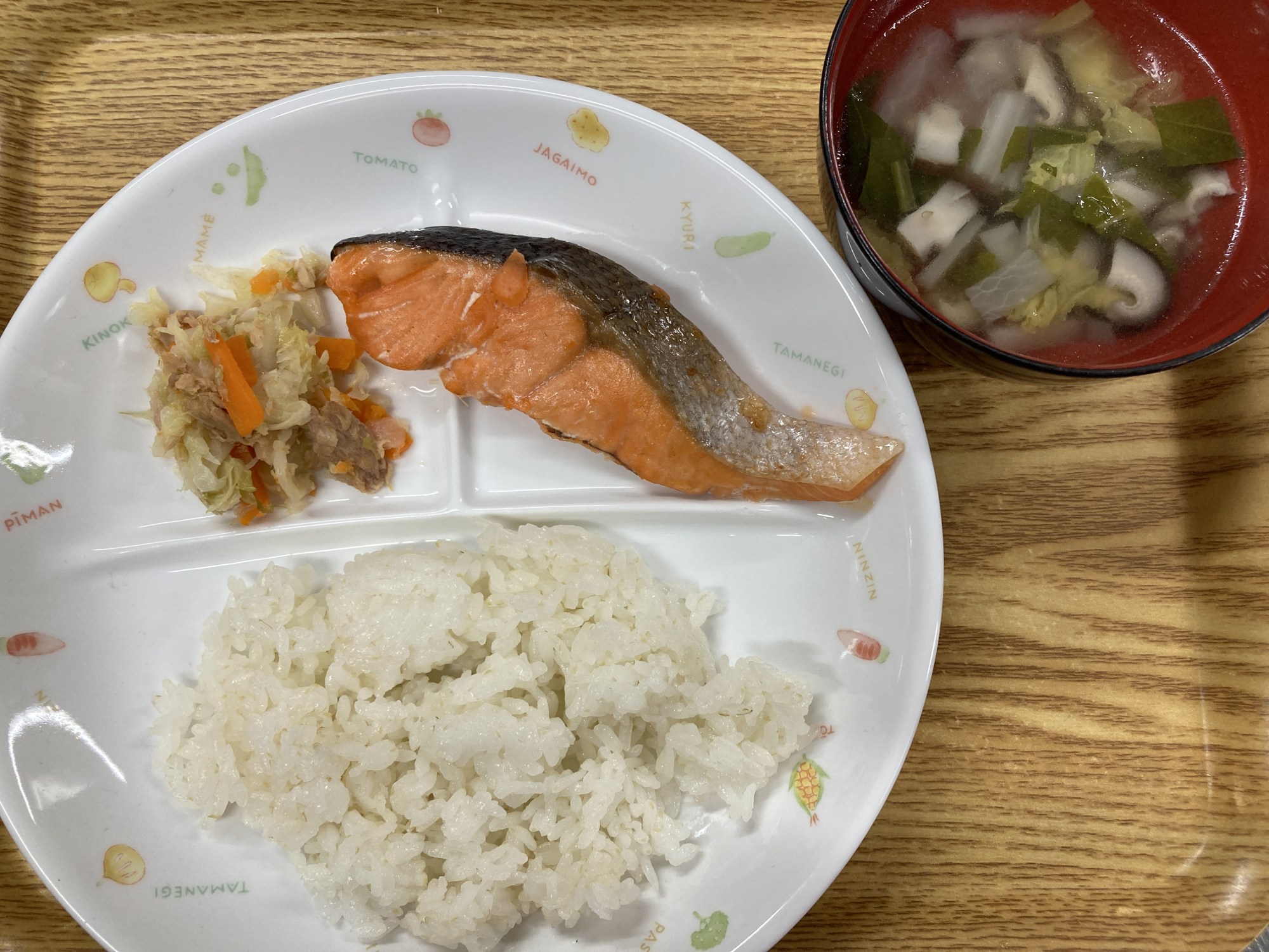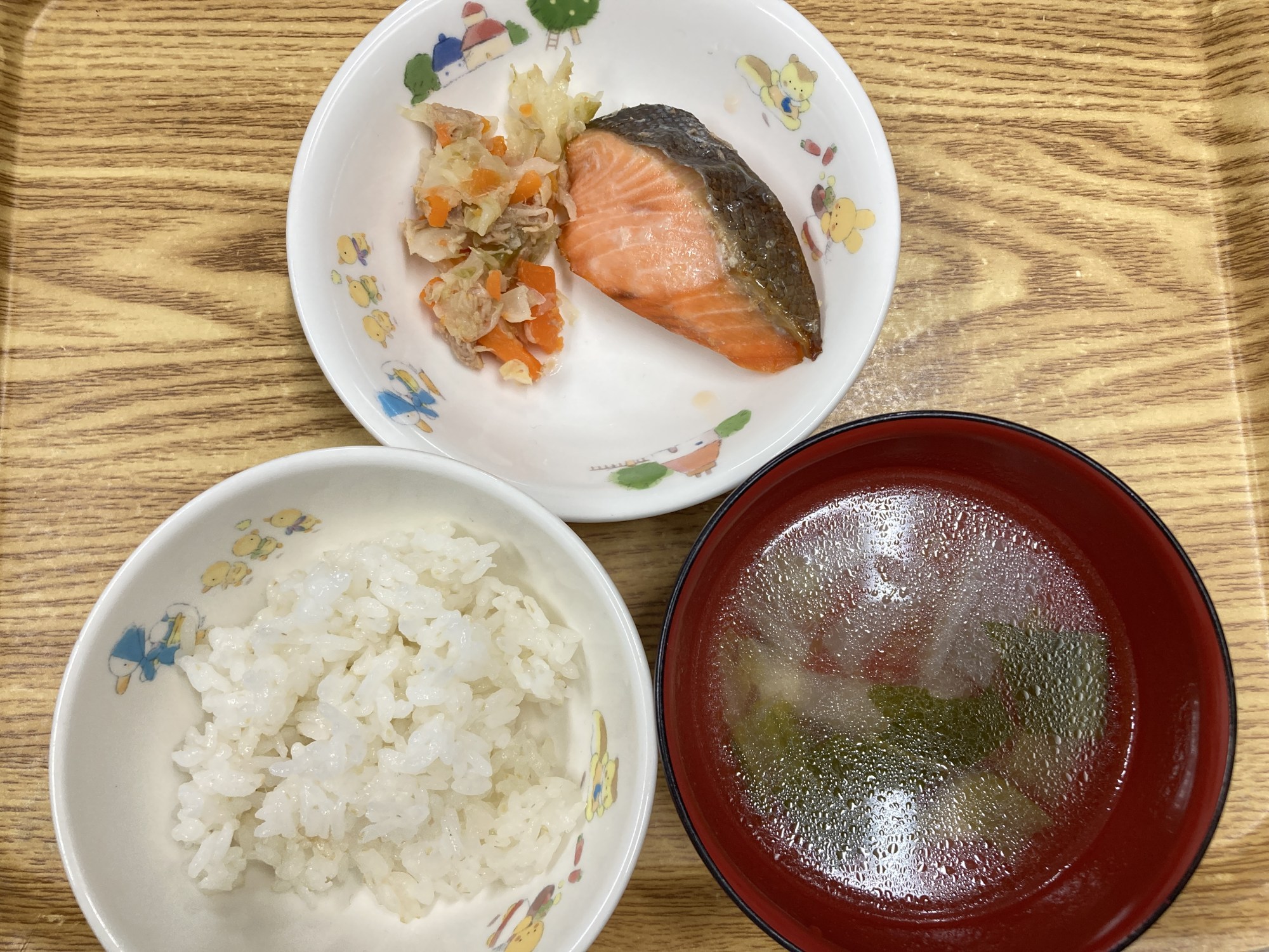 1枚目:【普通食:以上児】サケの塩醤油バター焼き・人参しりしりサラダ・大根スープ