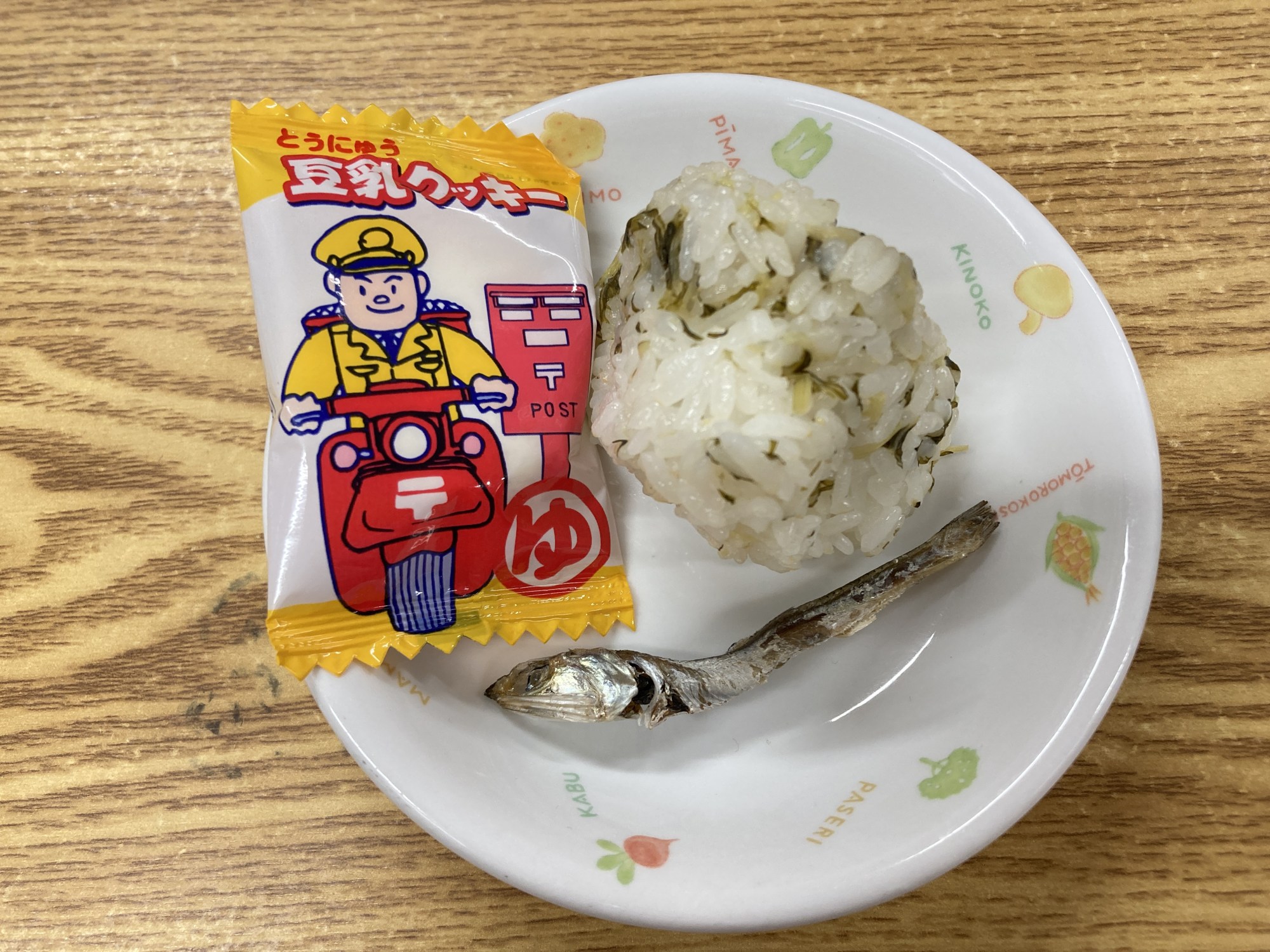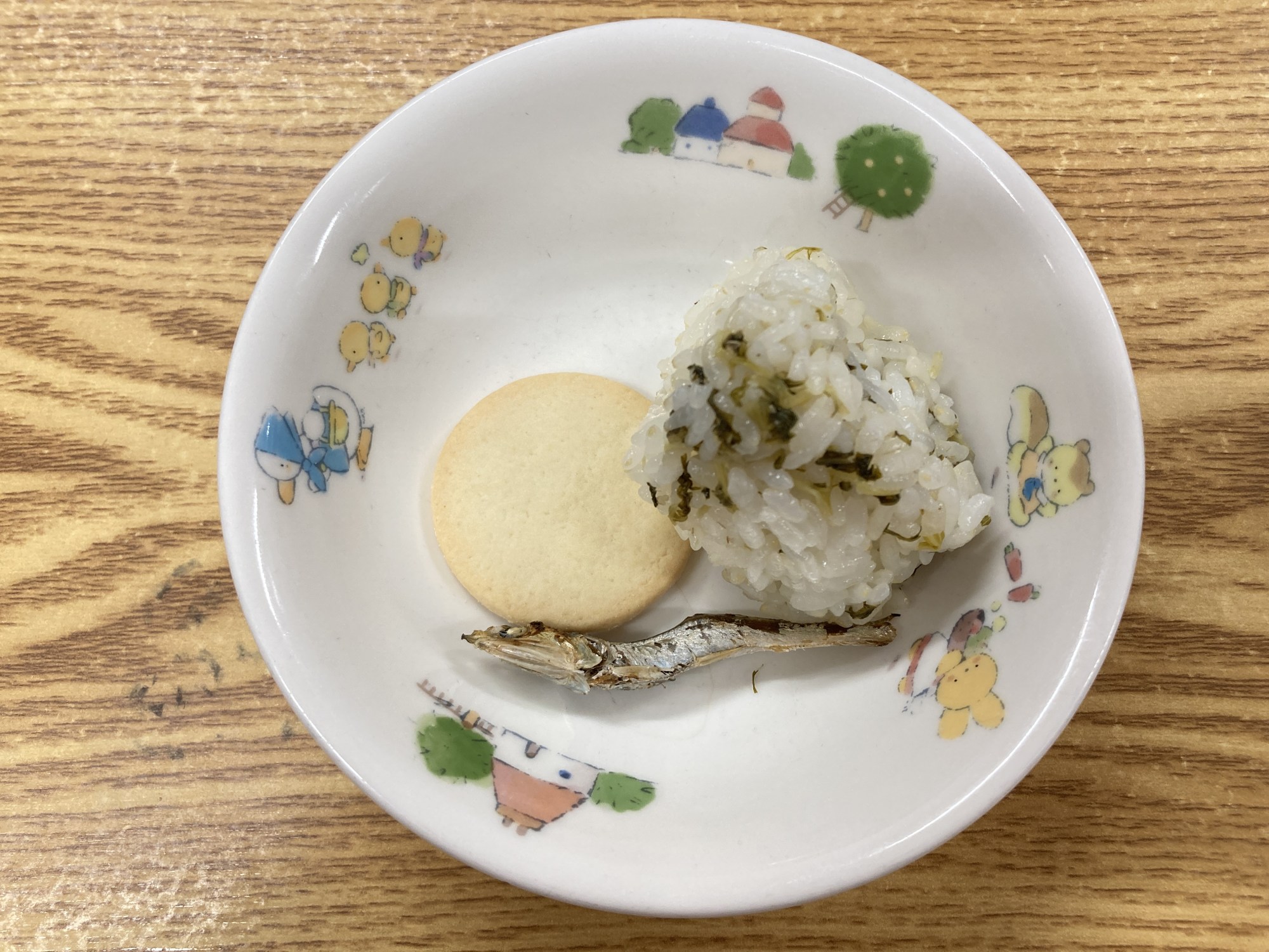 2枚目:【おやつ:以上児】♪水菜のおにぎり・♪甘辛じゃこ・お菓子
