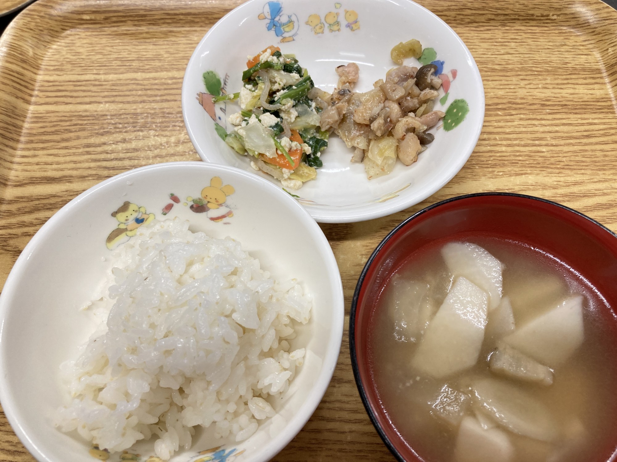 1枚目:【普通食:以上児】鶏肉のおかか炒め・きな粉白和え・みそけんちん汁