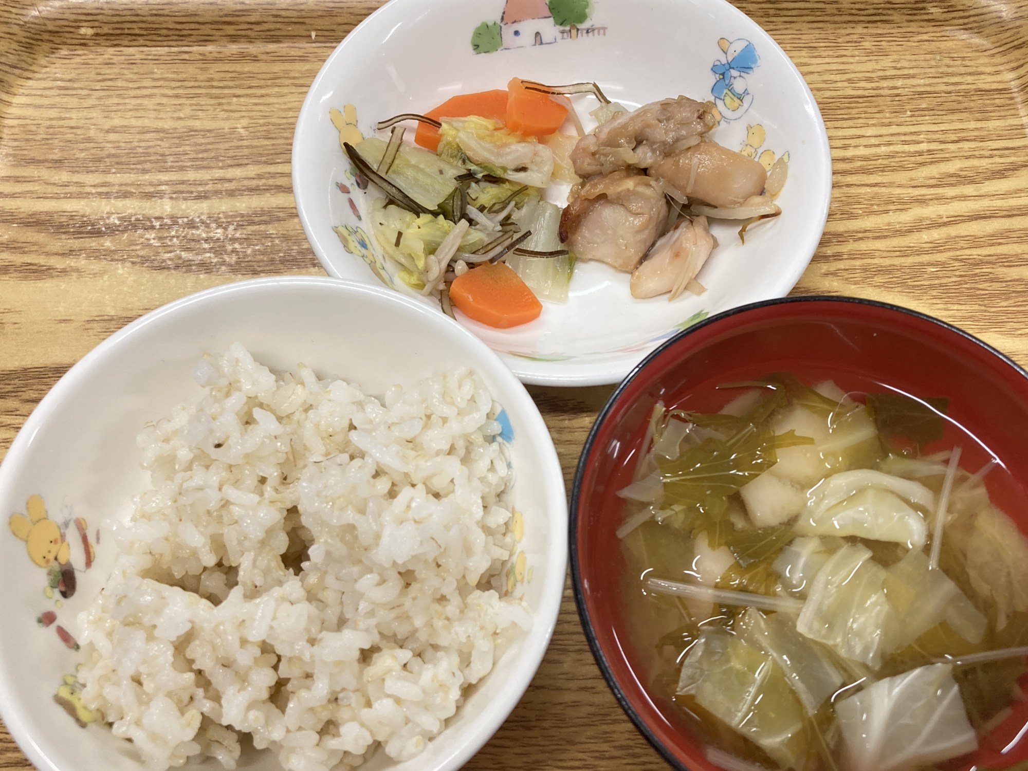 1枚目:【普通食:以上児】鶏肉の甘辛照り焼き・白菜の浅漬け・キャベツのみそ汁