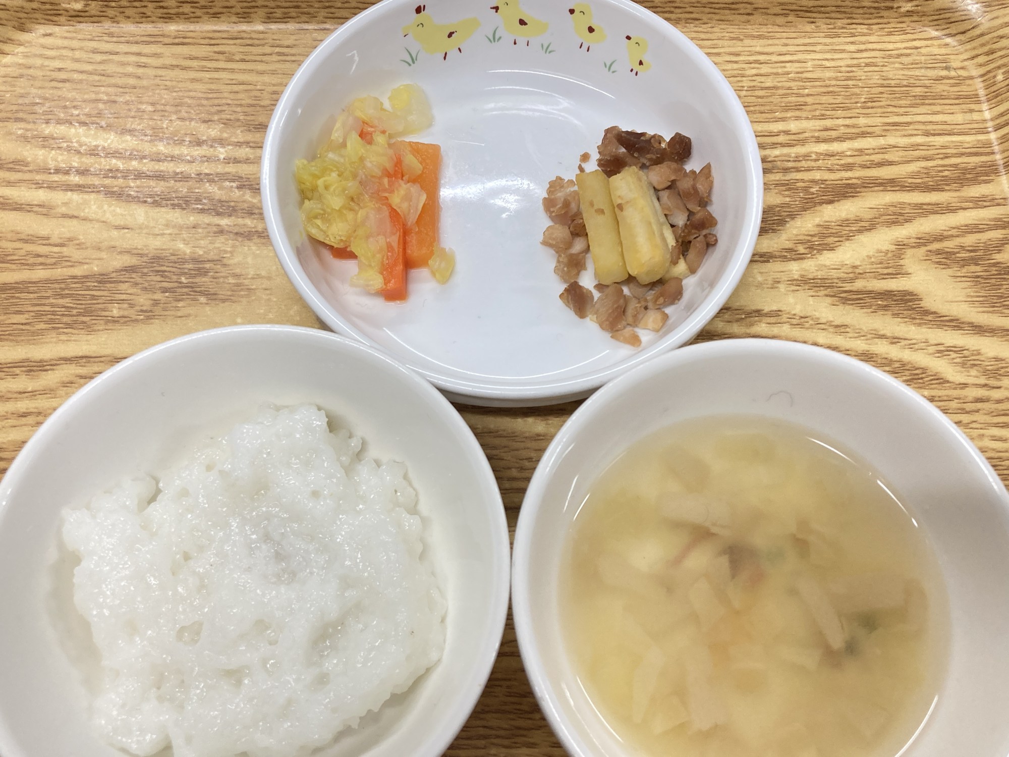 5枚目:【離乳食】鶏肉の照り焼き・白菜の浅漬け・キャベツのみそ汁