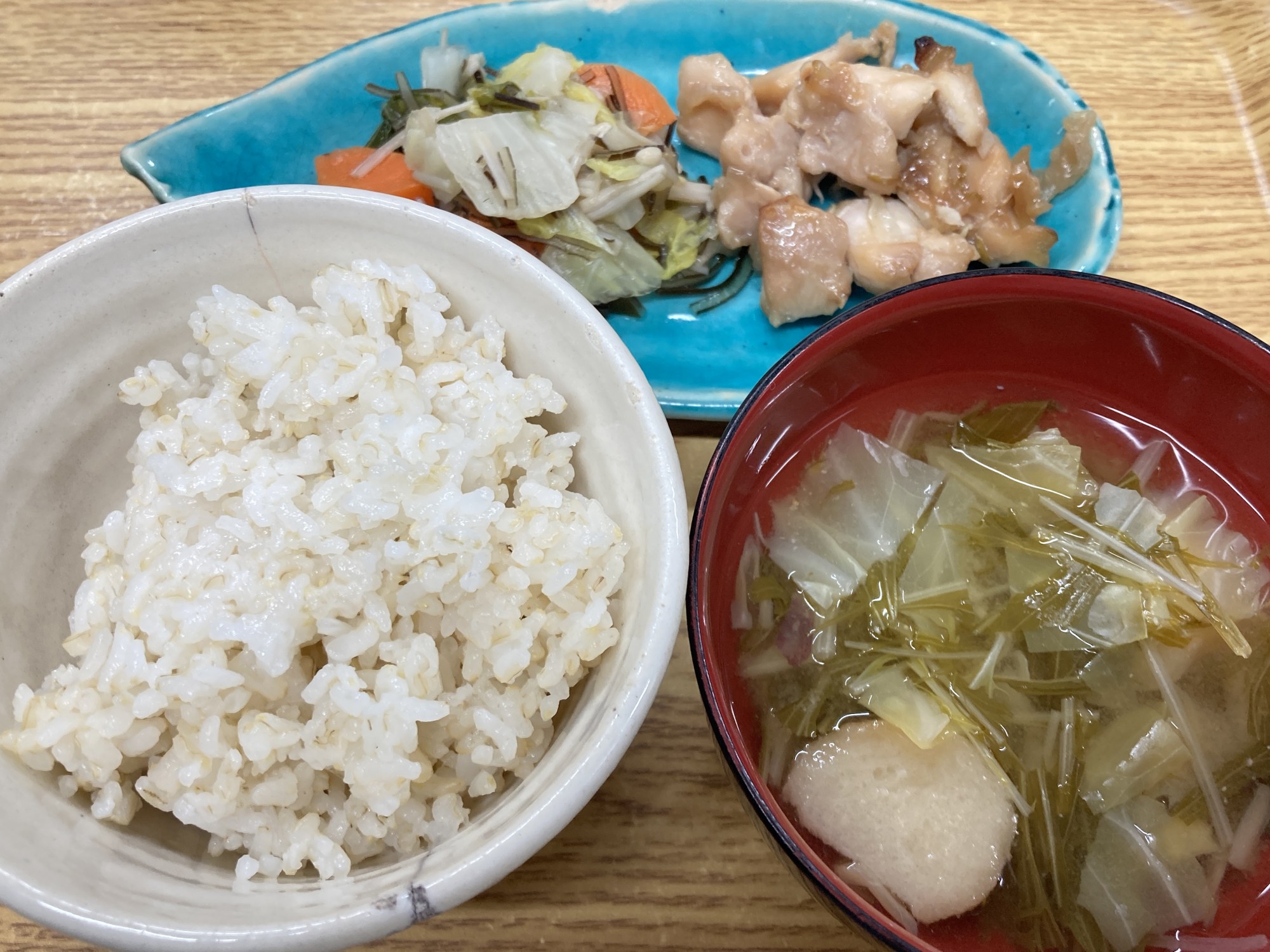 1枚目:【普通食:以上児】鶏肉の甘辛照り焼き・白菜の浅漬け・キャベツのみそ汁