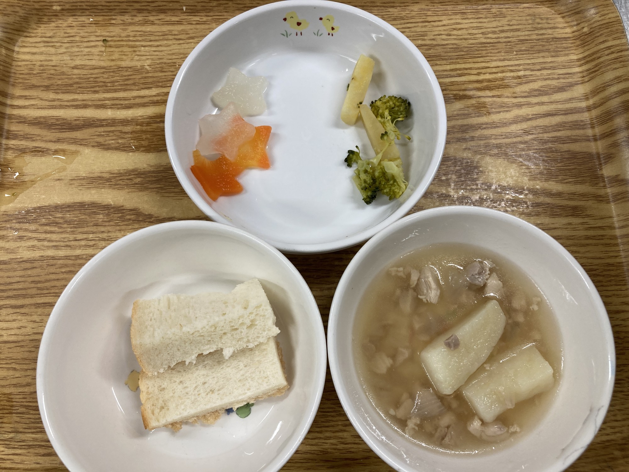 5枚目:【離乳食】食パン・鶏肉のポトフ・型抜き野菜・おさつサラダ