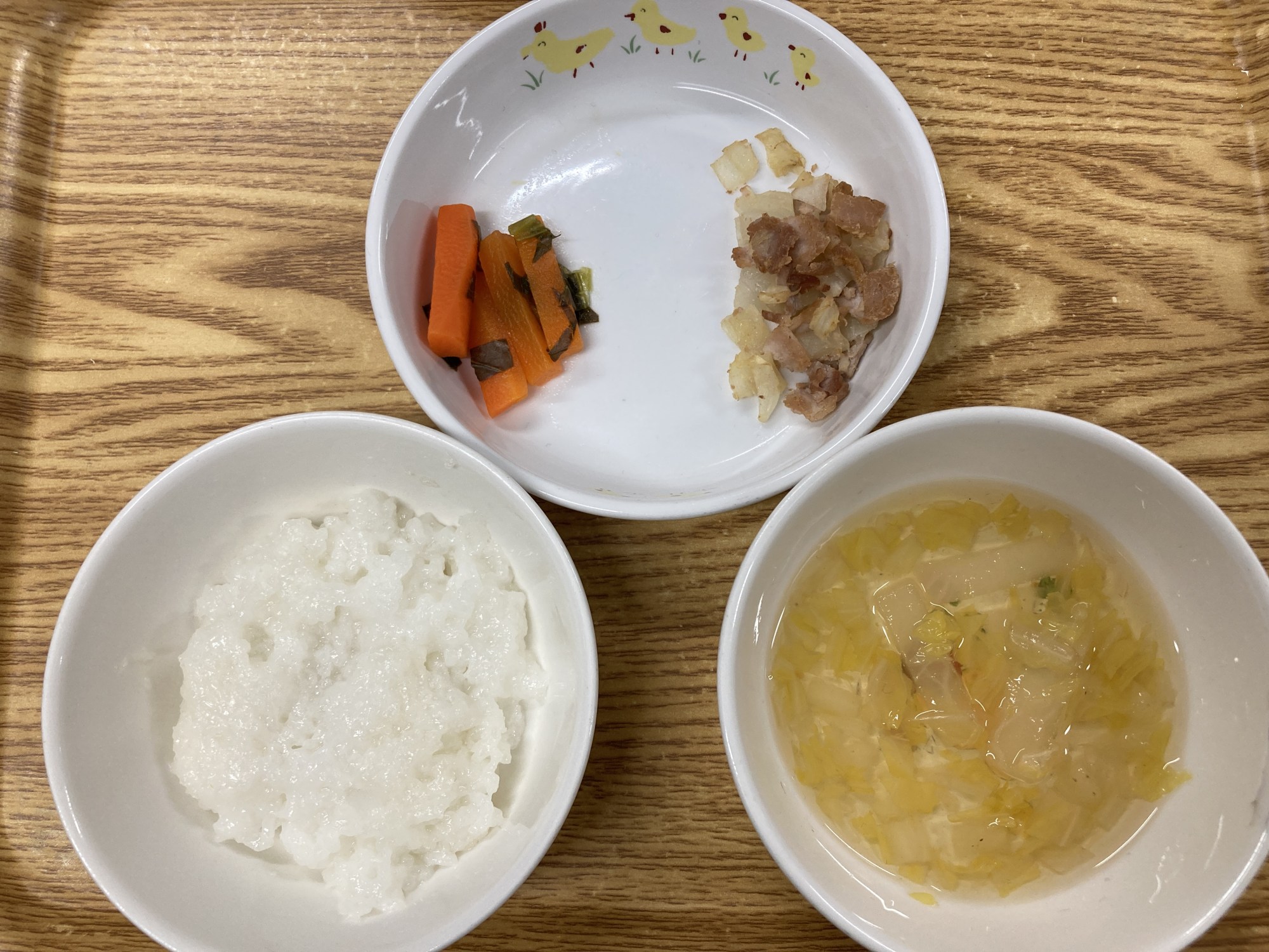 5枚目:【離乳食】豚肉の醤油炒め・人参の煮物・白菜のすまし汁