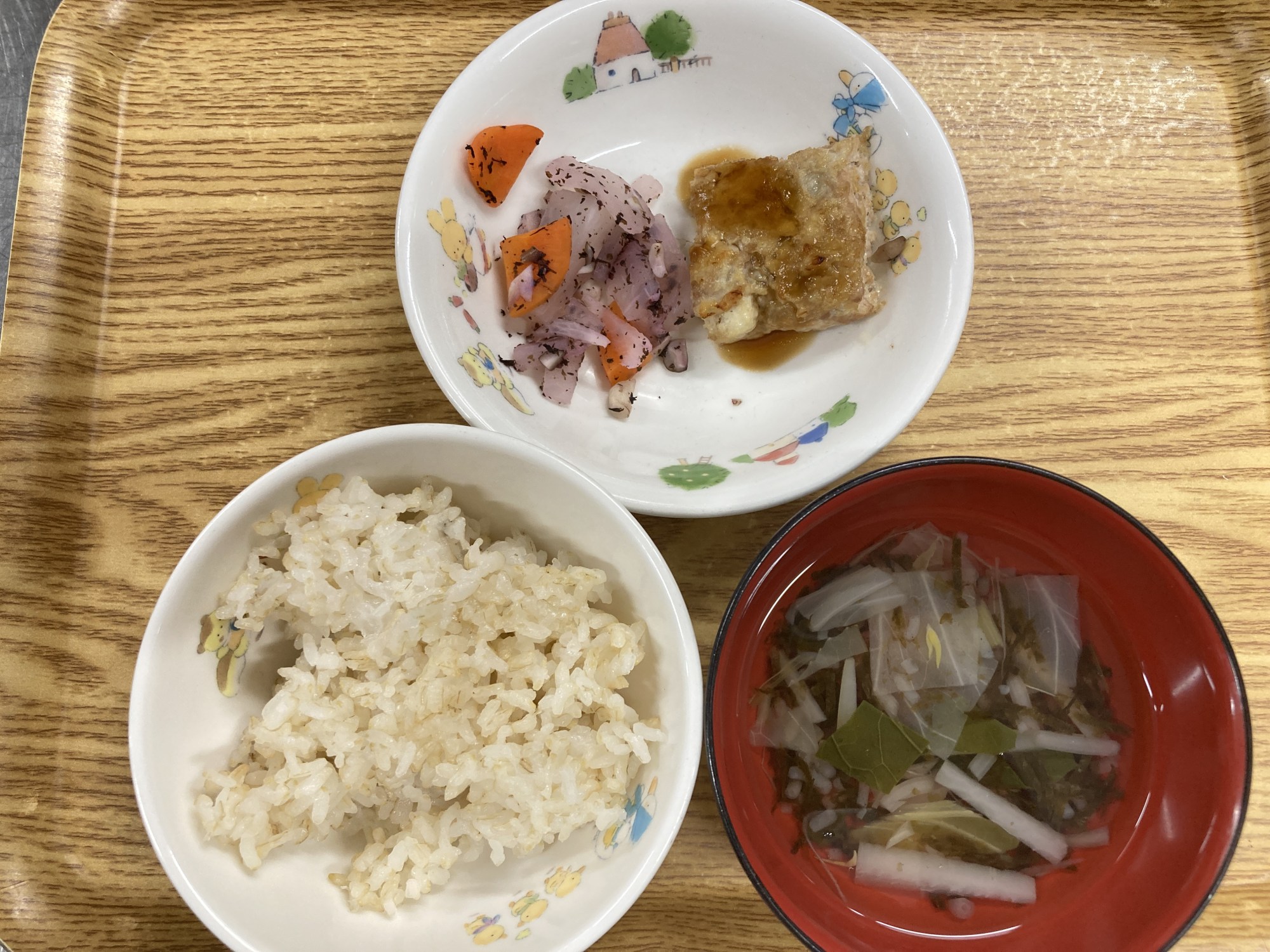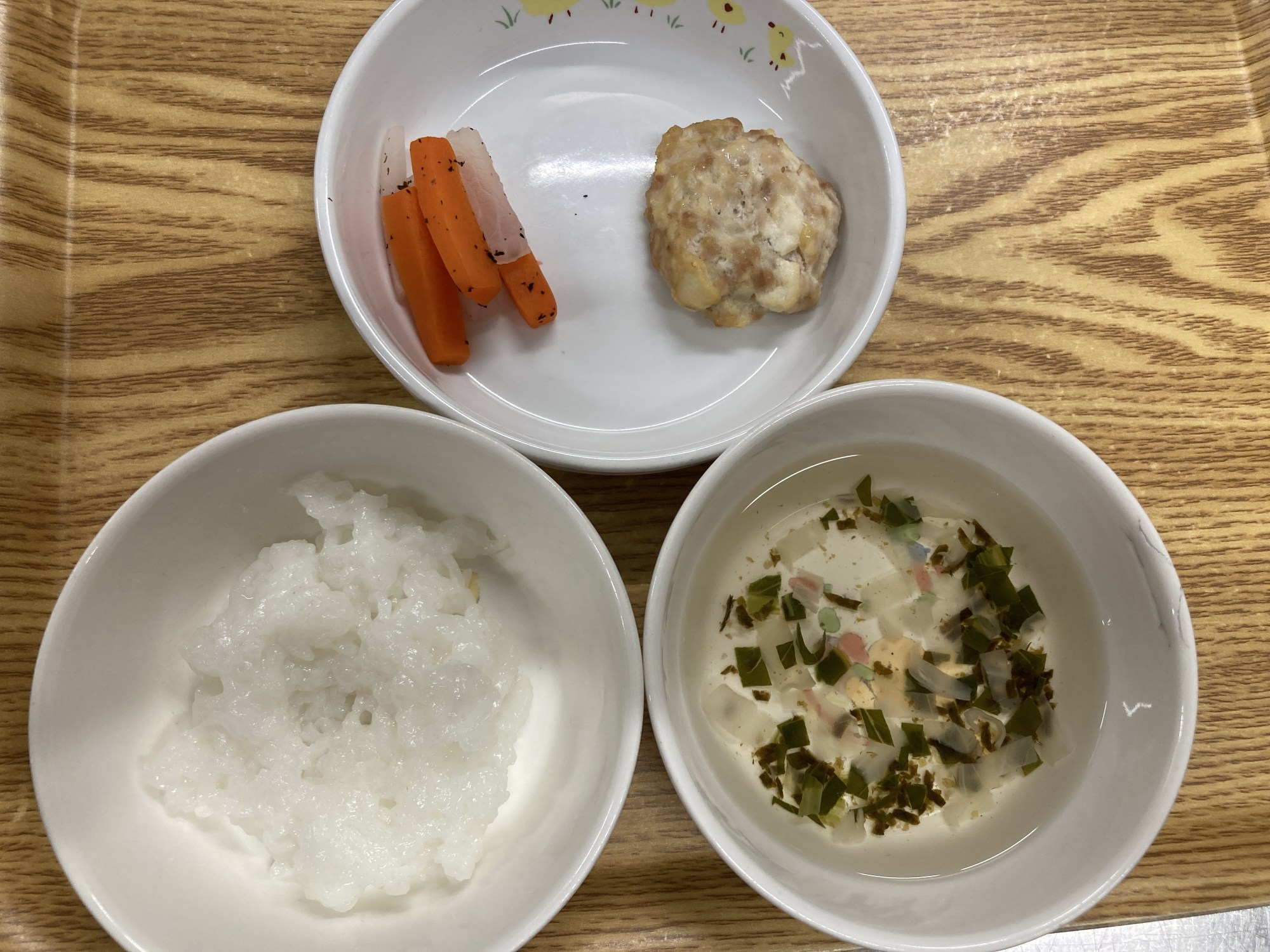 3枚目:【普通食:未満児】鶏の照り焼きハンバーグ・大根のゆかり漬け・のり入りお吸い物