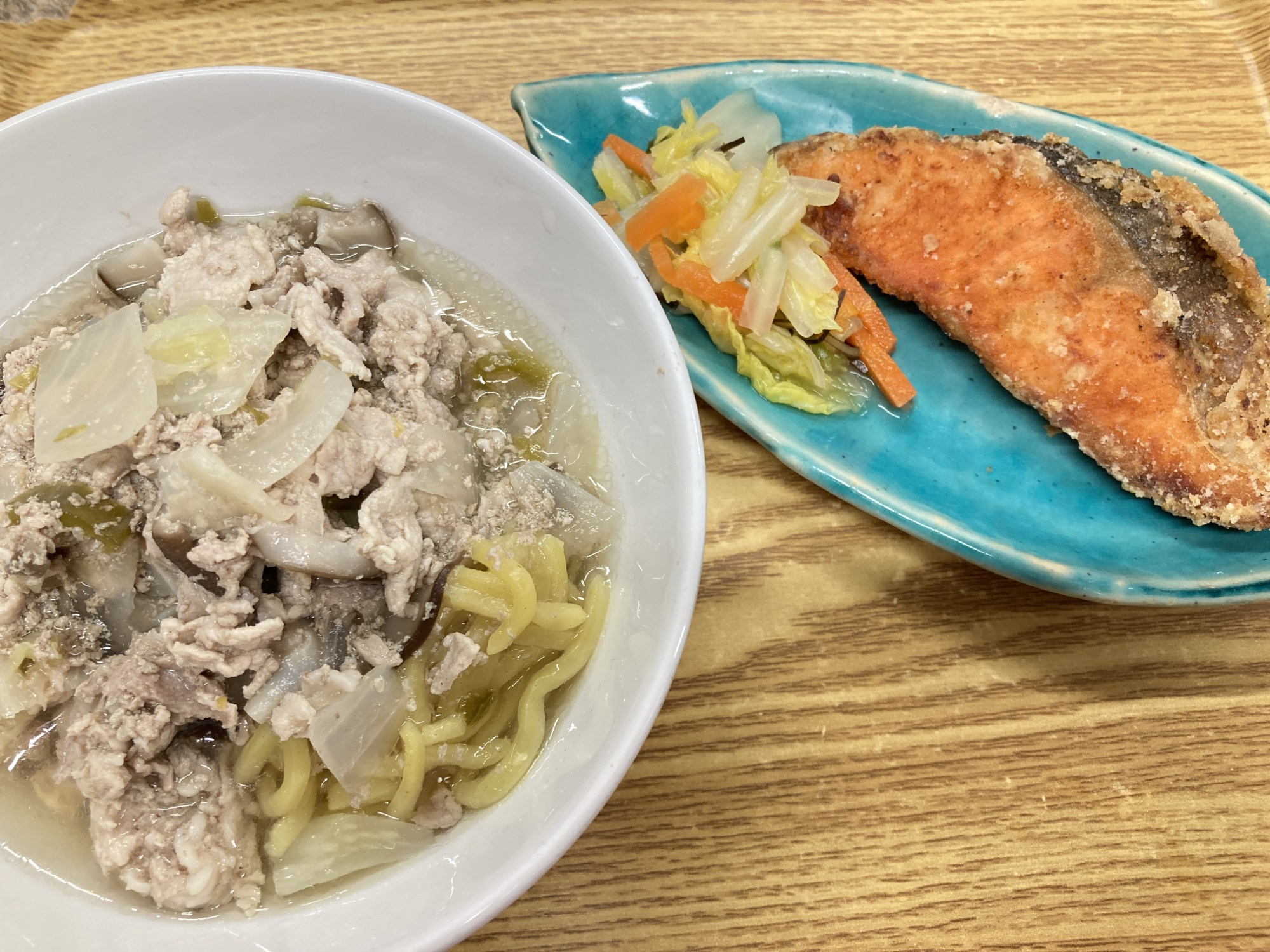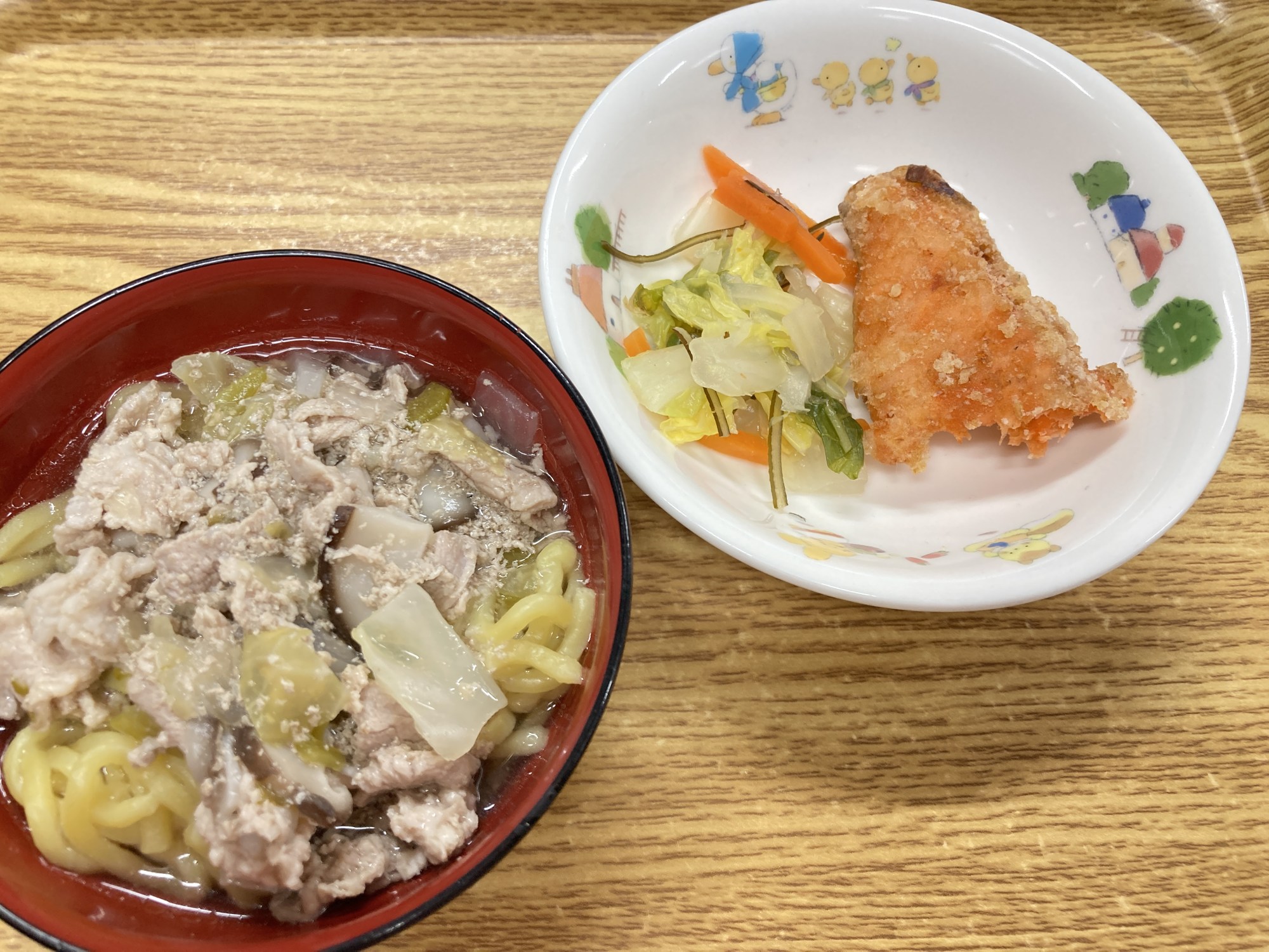 1枚目:【普通食:以上児】醤油塩ラーメン・サケの唐揚げ・白菜の漬物