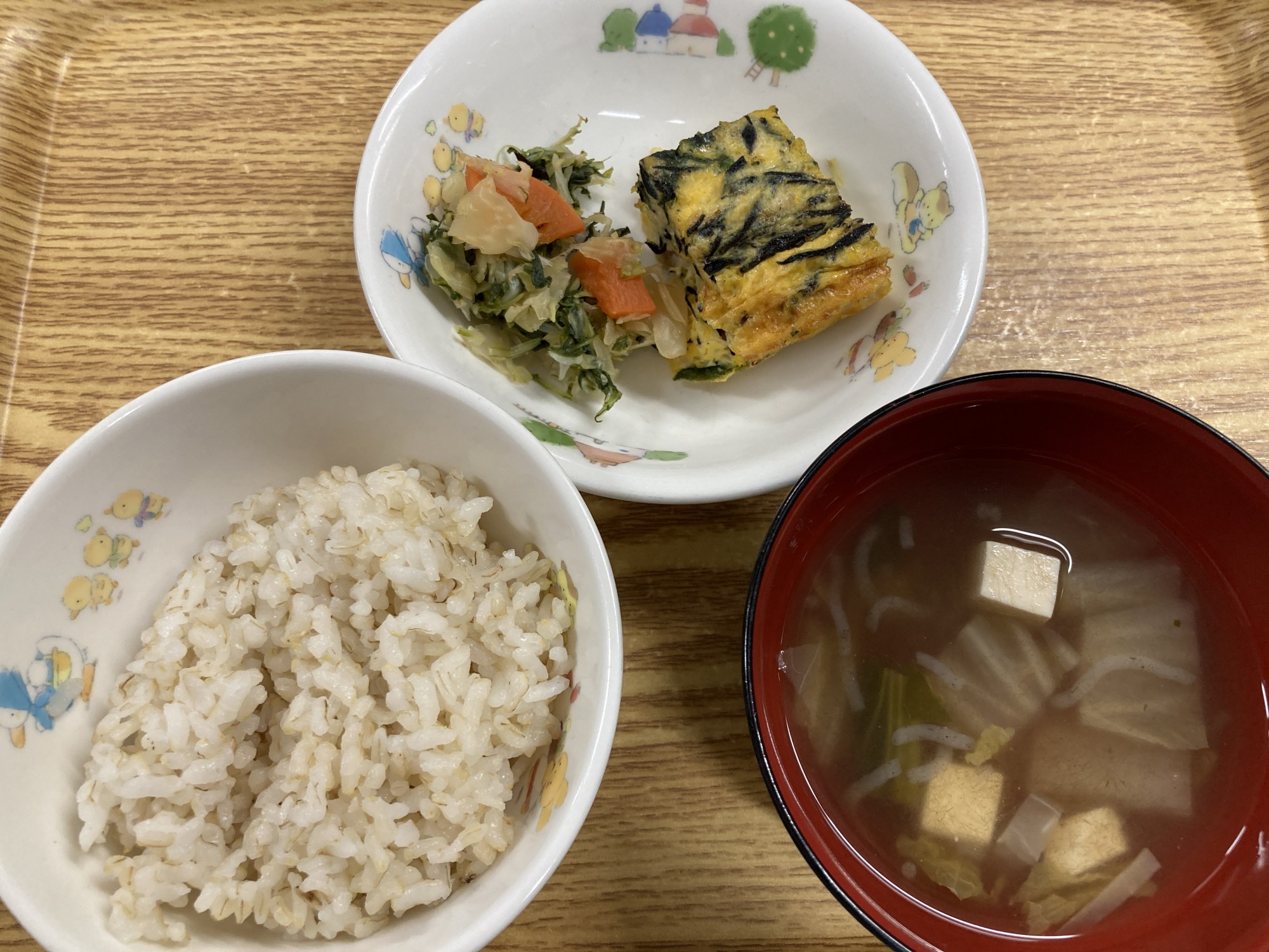 1枚目:【普通食:以上児】ほうれん草の焼き卵・おかか和え・うすくず汁