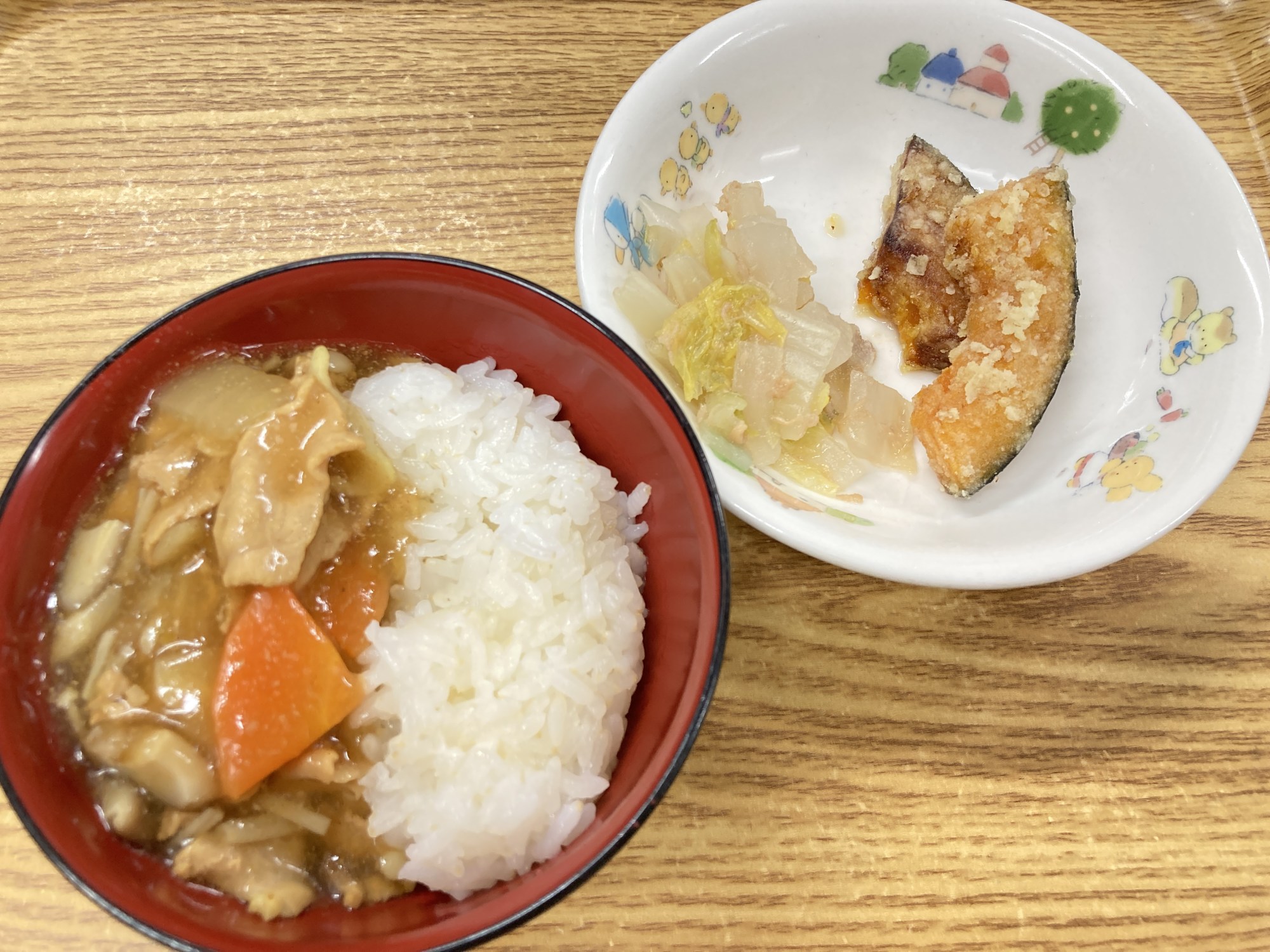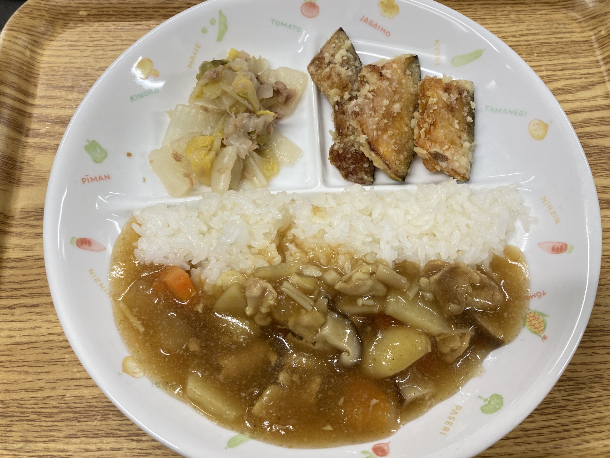 1枚目:【普通食:以上児】きのこのカレーライス・南瓜の唐揚げ・大根の和え物