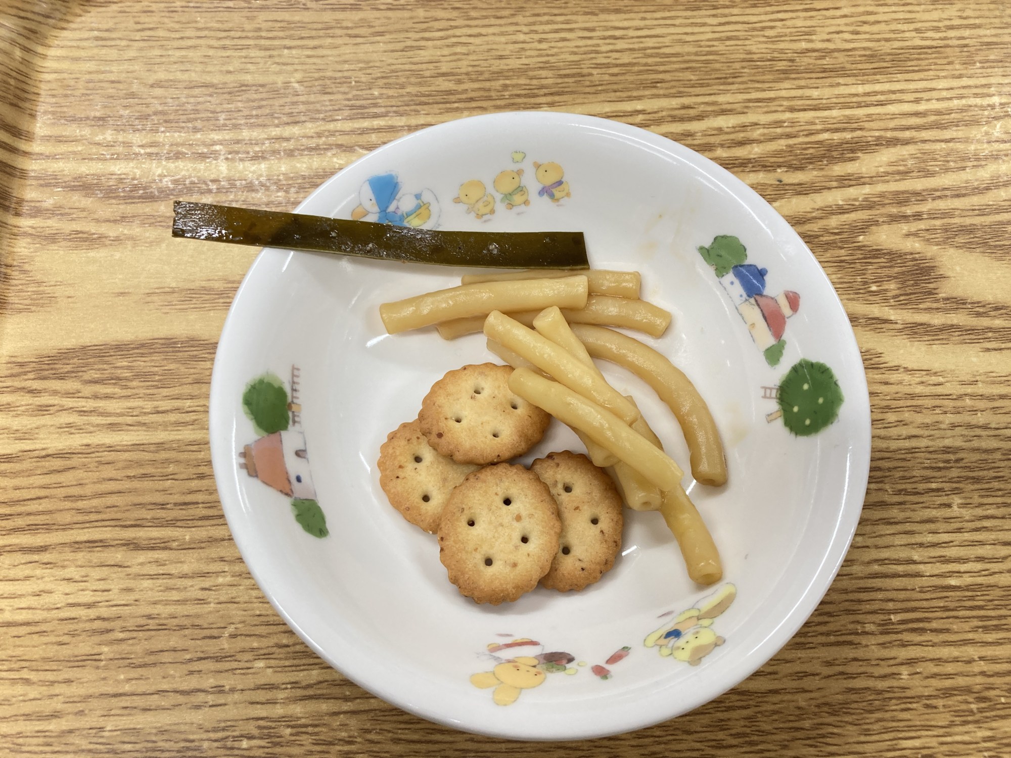2枚目:【おやつ:以上児】♪みたらしマカロニ・♪ごまこんぶ・お菓子