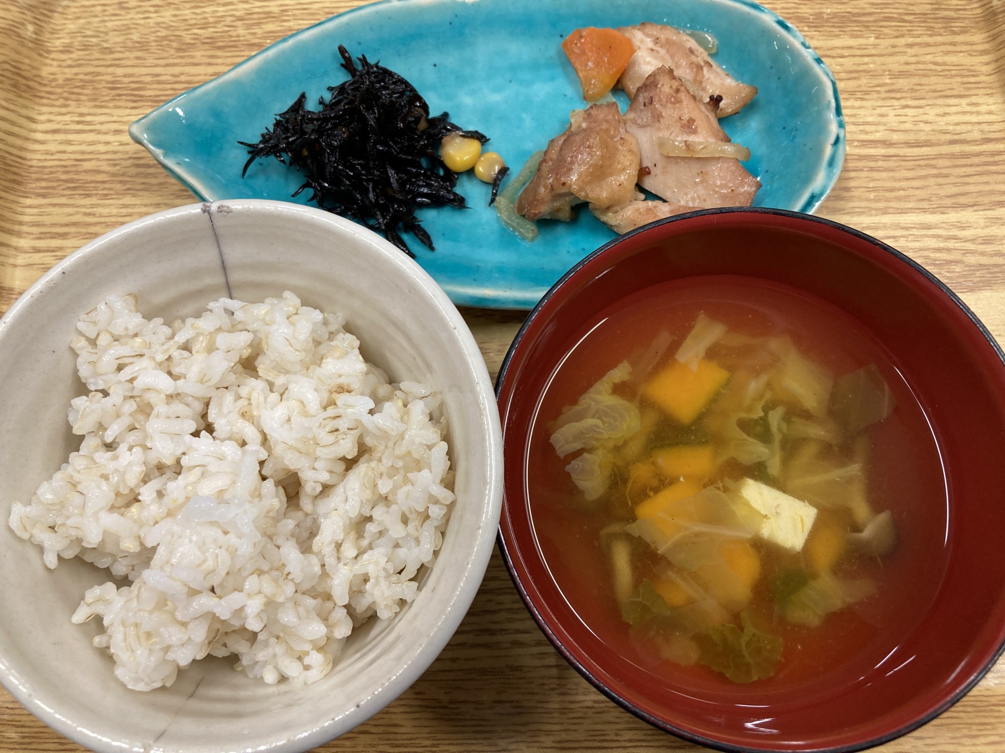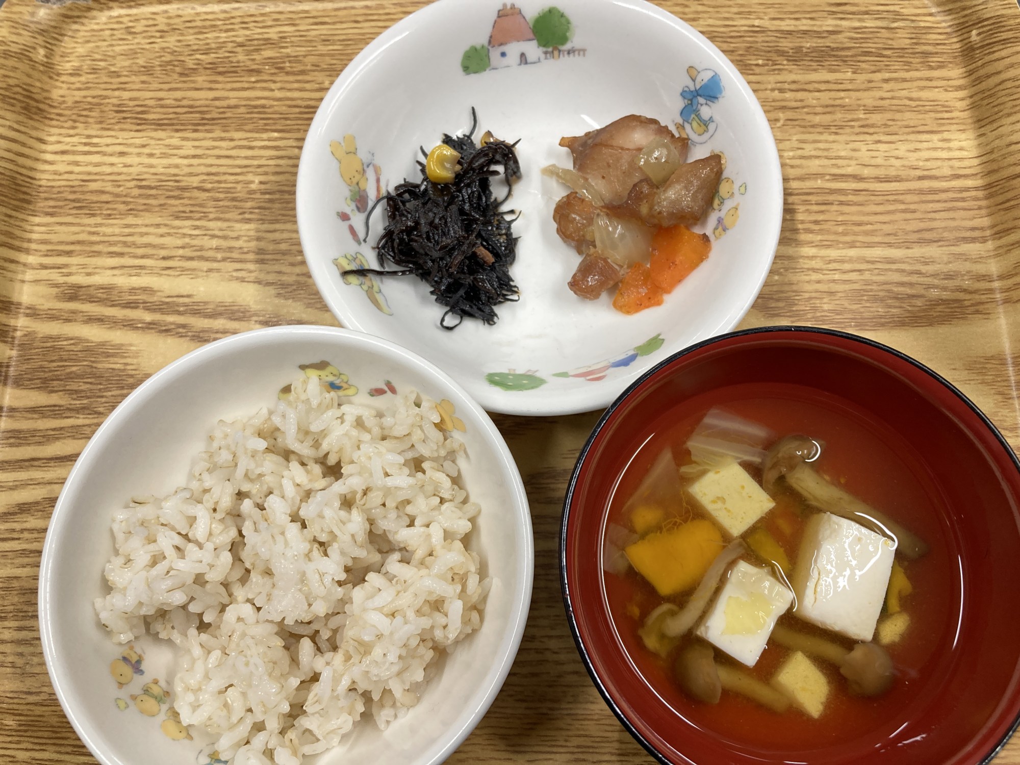 1枚目:【普通食:以上児】鶏肉のおかか焼き・ひじきの煮物・なめこの和風スープ