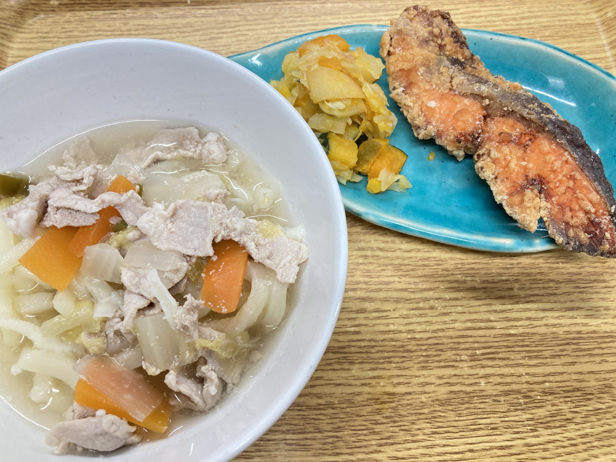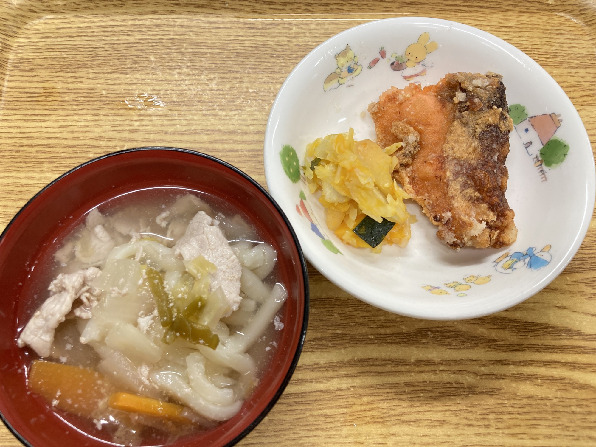 1枚目:【普通食:以上児】醤油うどん・サケの唐揚げ・野菜たっぷりサラダ