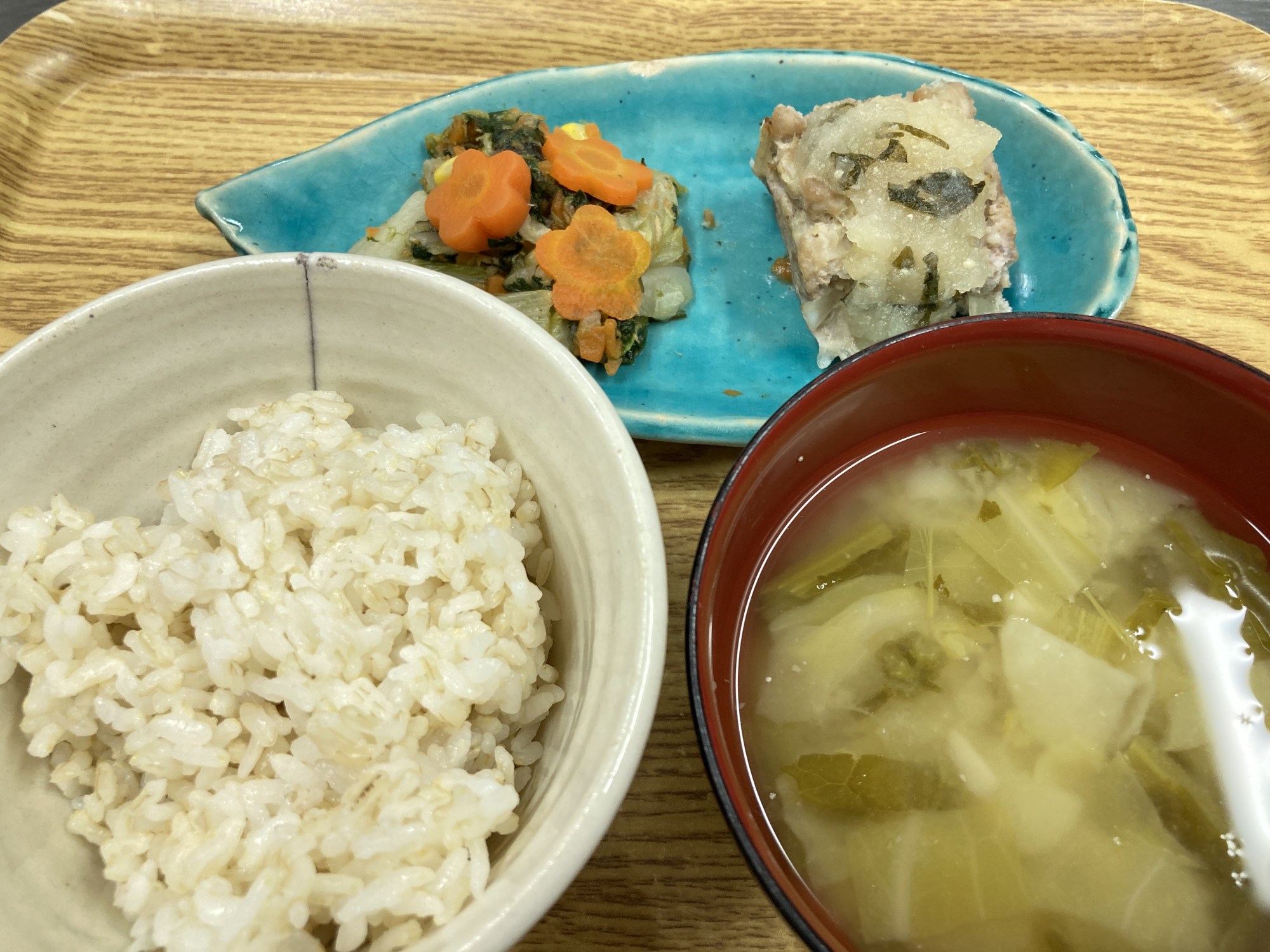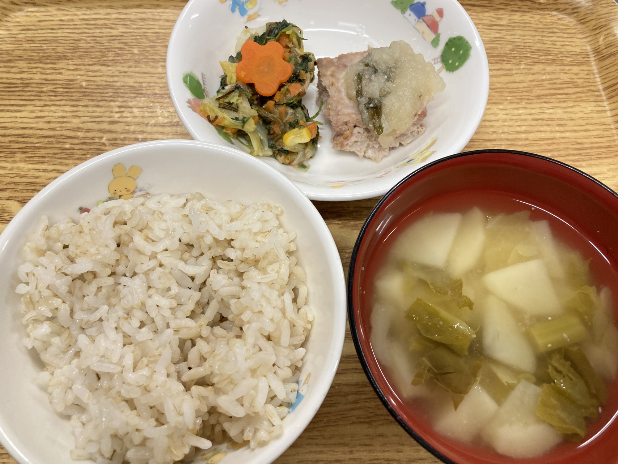 1枚目:【普通食:以上児】おろしポン酢ハンバーグ・白菜とツナの昆布和え・ごまみそ汁