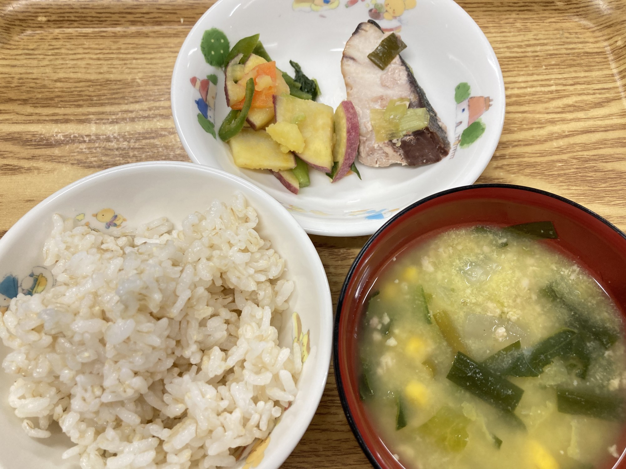 1枚目:【普通食:以上児】ブリのねぎ塩だれ焼き・さつま芋の和え物・和風コーンスープ