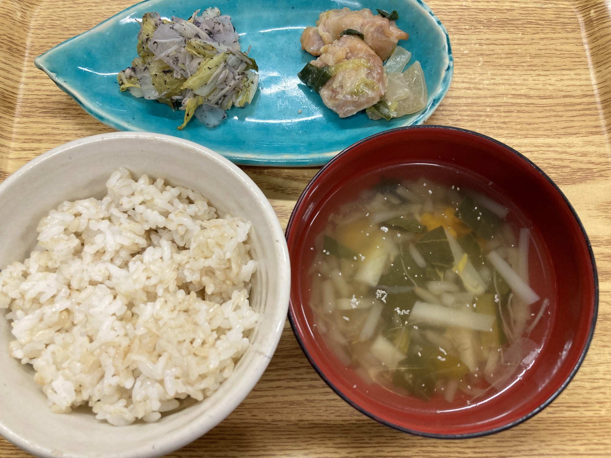 1枚目:【普通食:以上児】鶏肉のねぎ塩焼き・ゆかり和え・ごま入りすまし汁