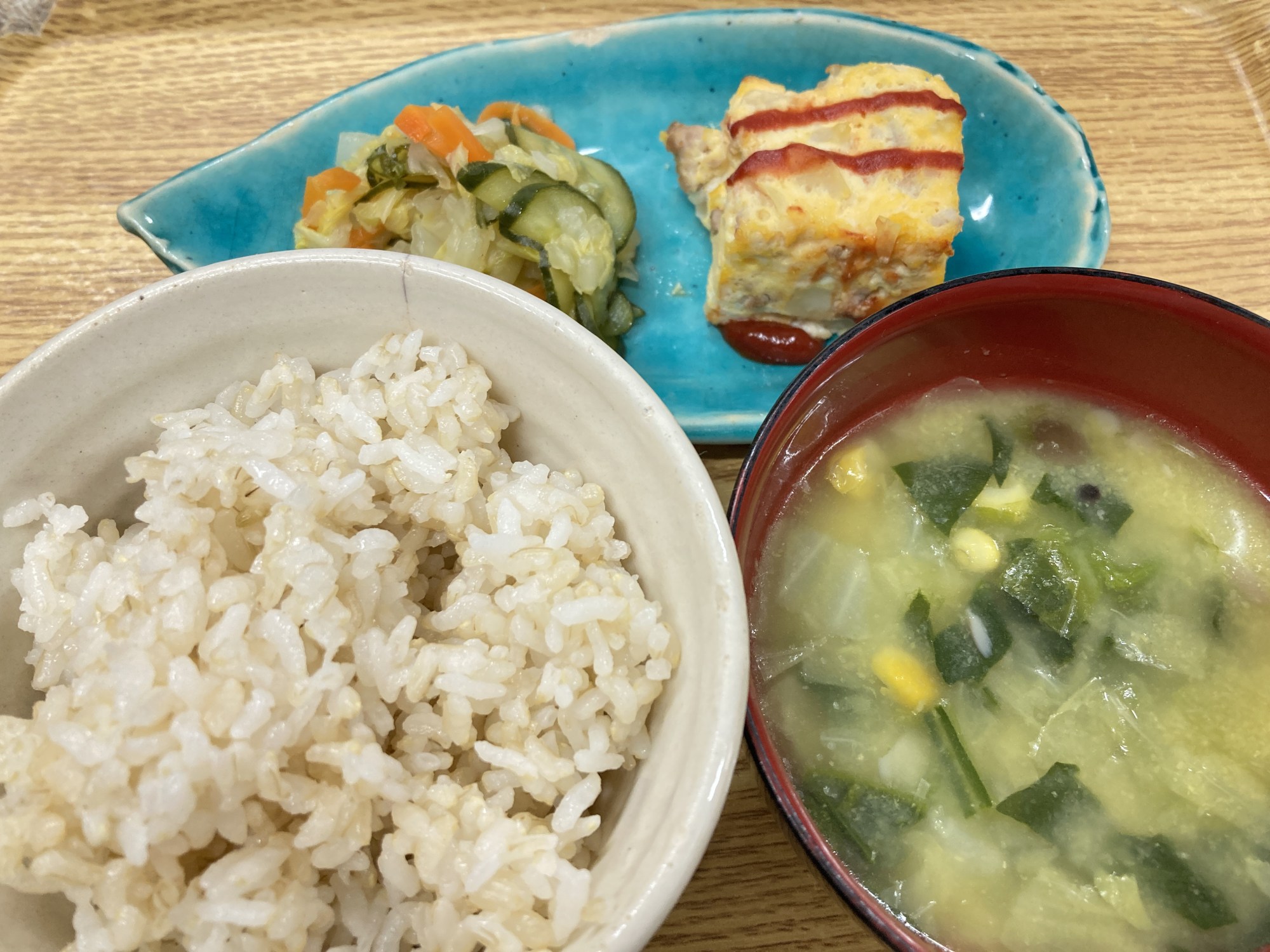 1枚目:【普通食:以上児】豆腐オムレツ・白菜と人参のサラダ・コーンスープ