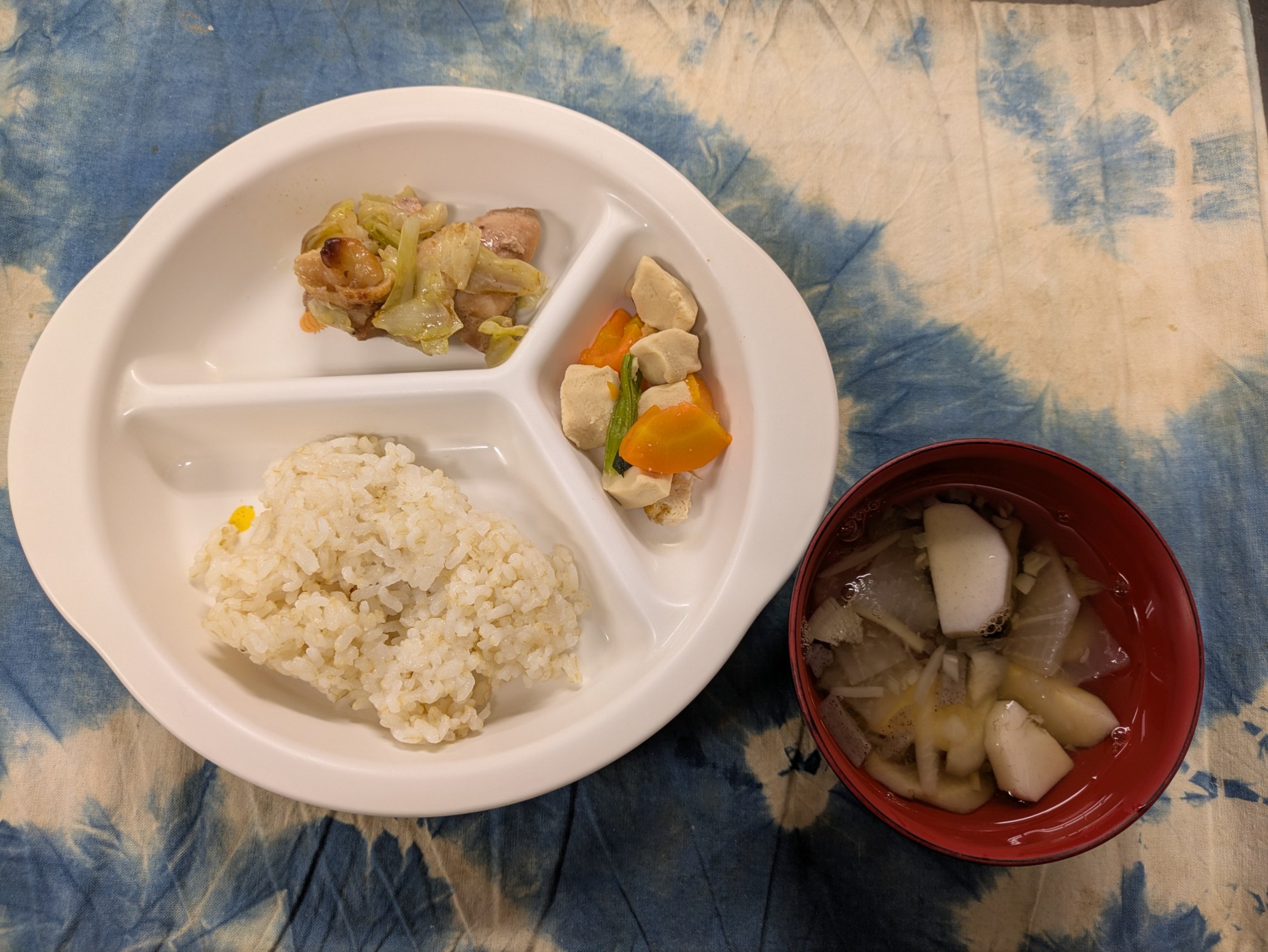 1枚目:【以上児:普通食】鶏肉のおかか焼き・高野豆腐の煮物・けんちん汁