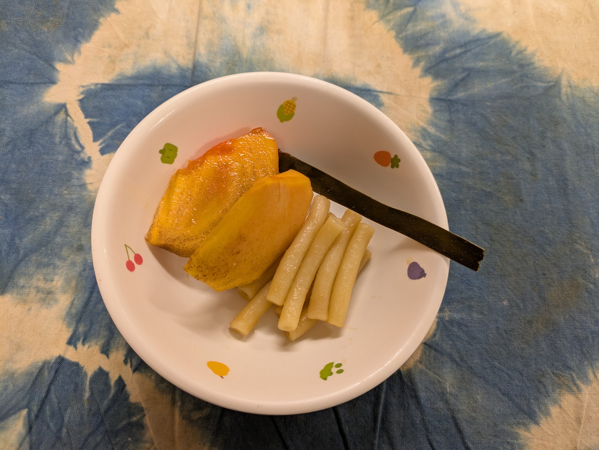2枚目:【以上児:おやつ】みたらしマカロニ・醤油こんぶ・くだもの