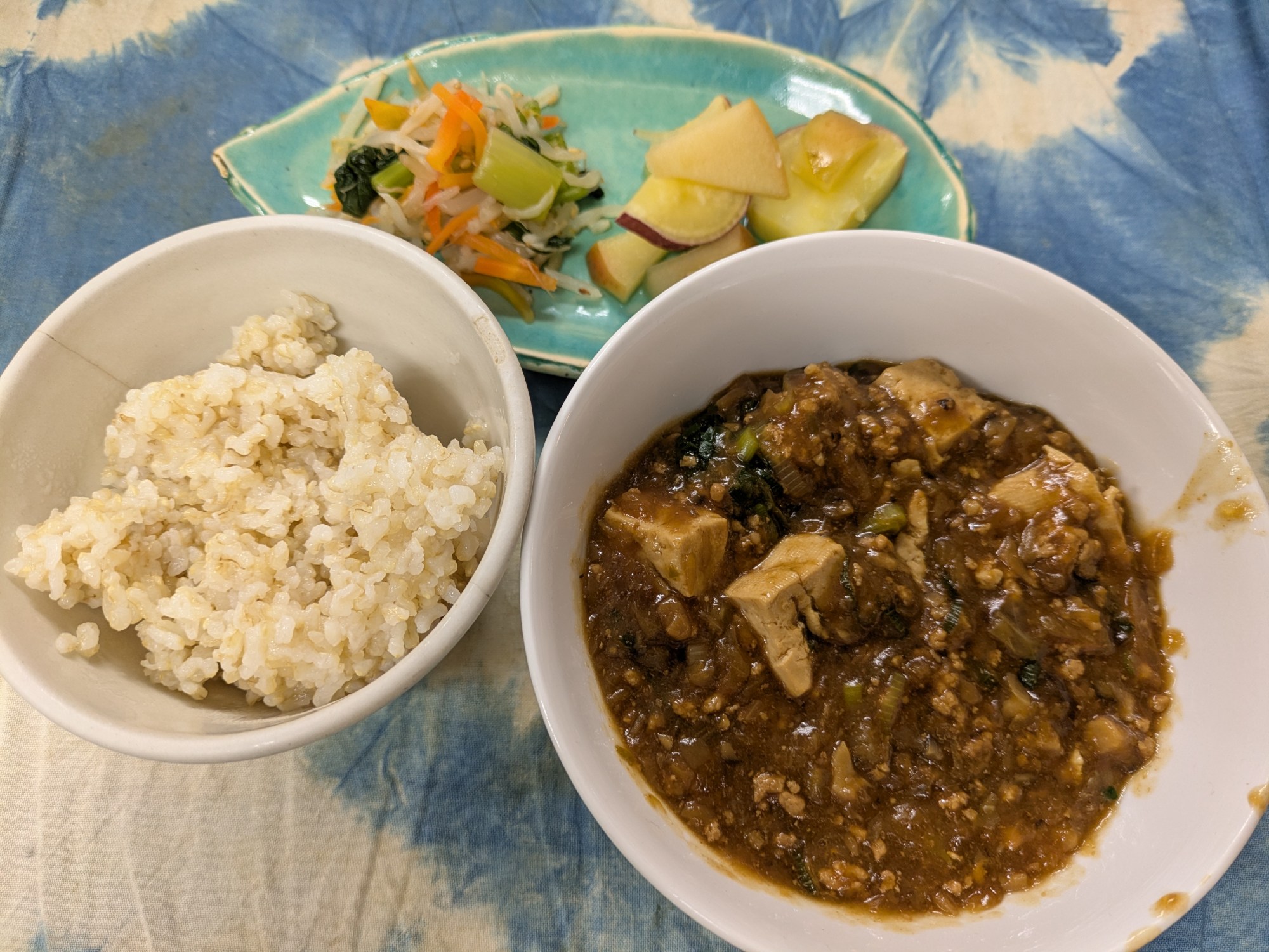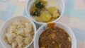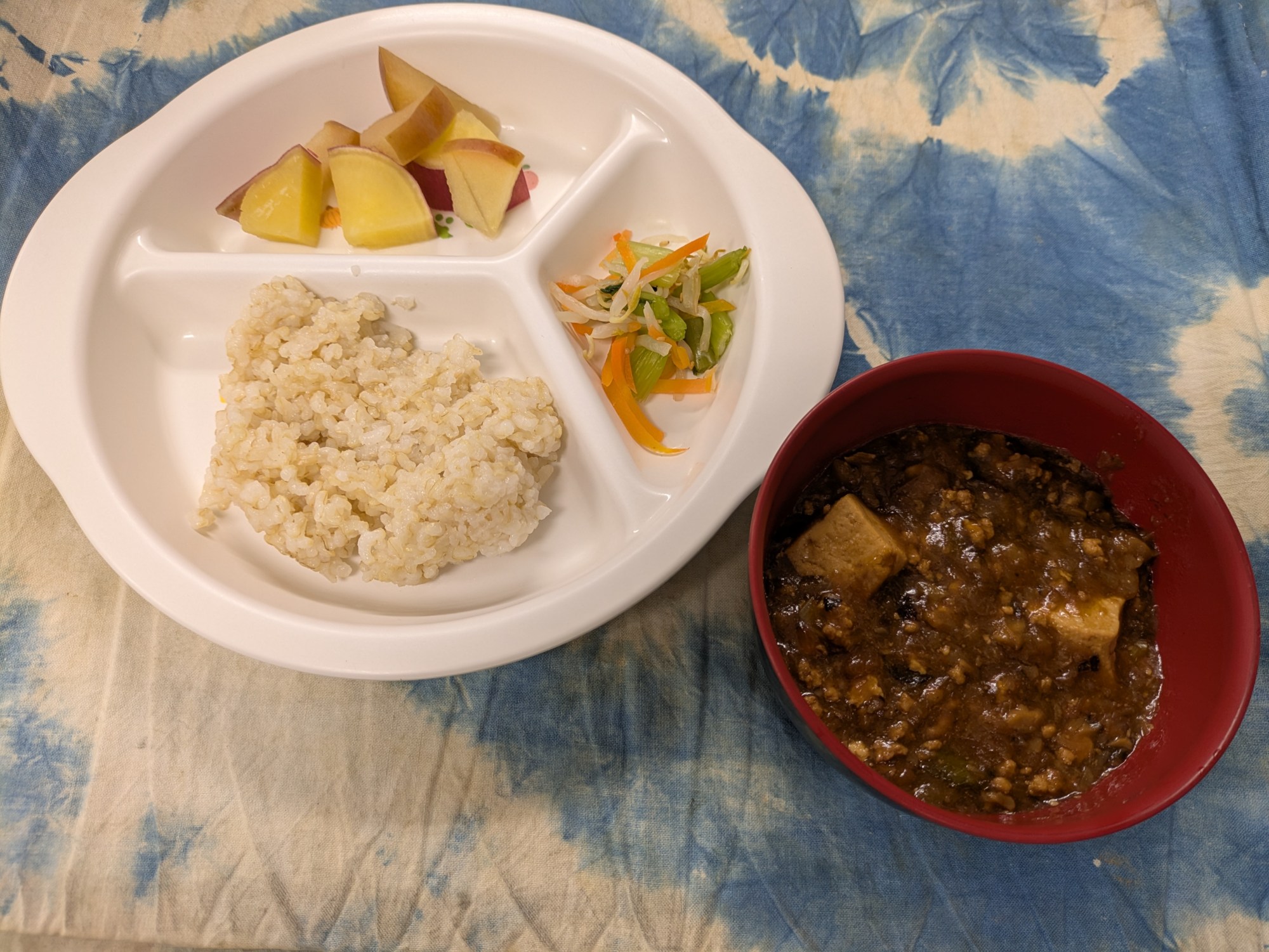 1枚目:【以上児:普通食】麻婆豆腐・さつま芋とりんごの甘煮・小松菜のナムル