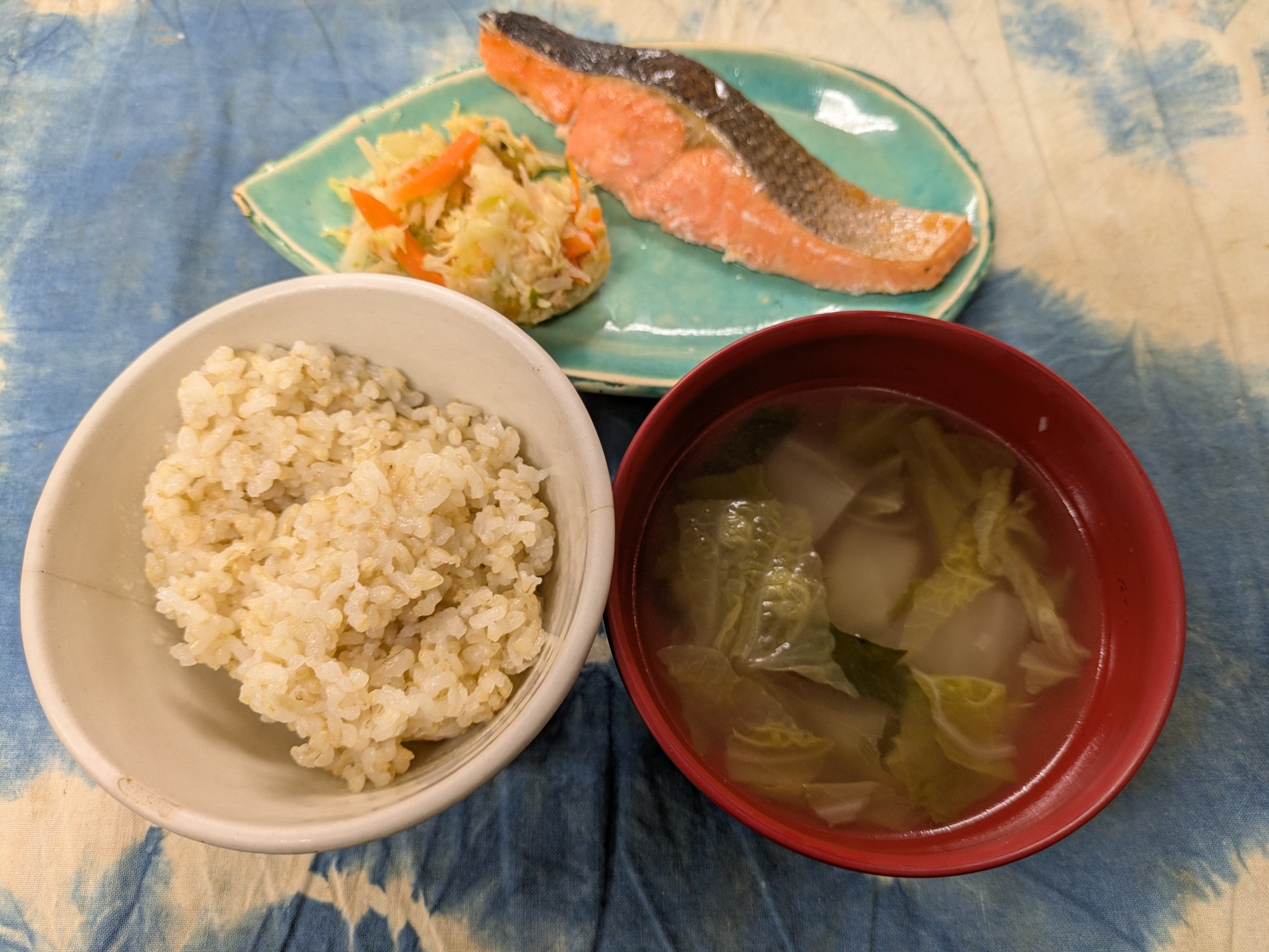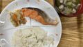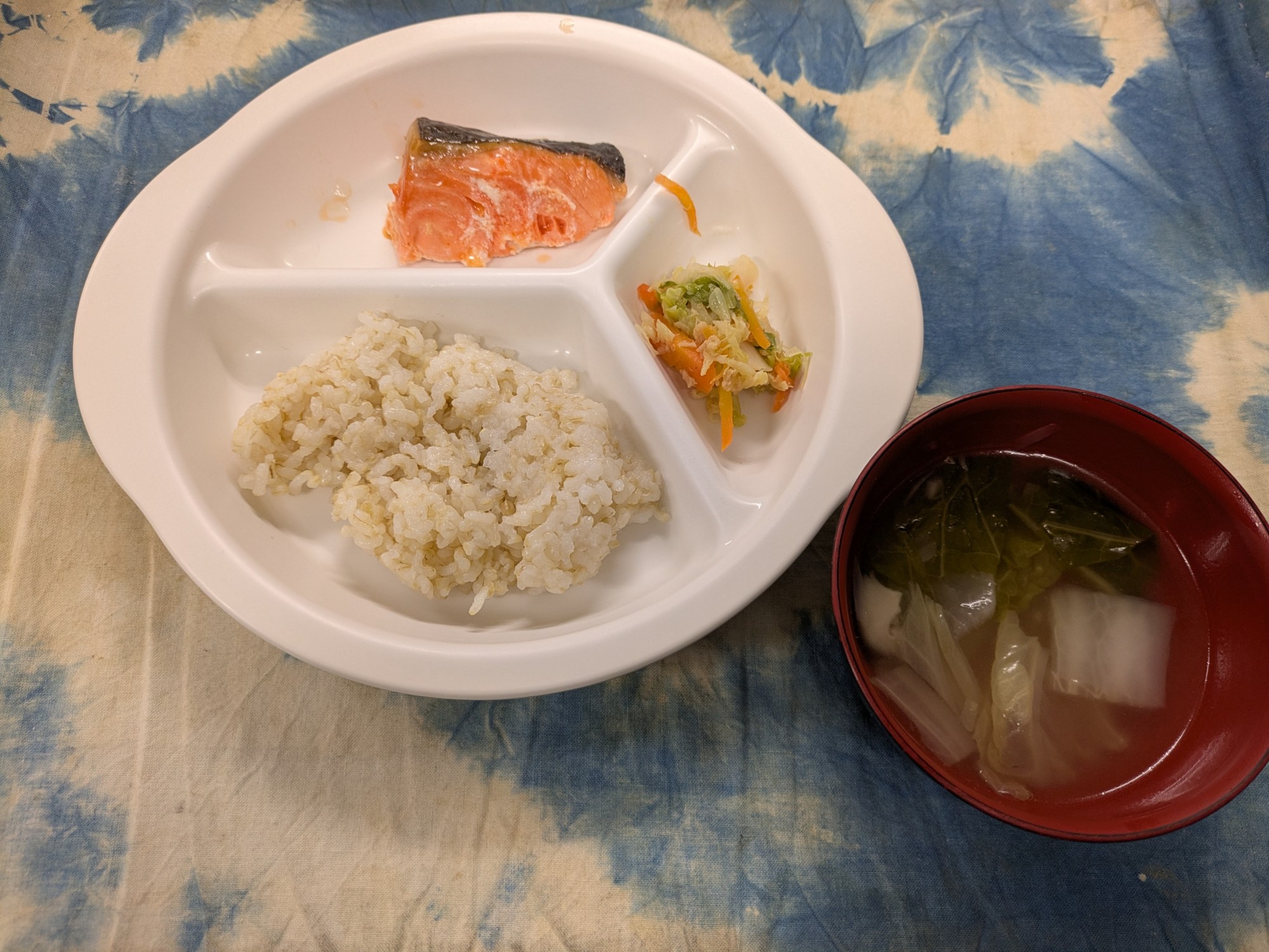 1枚目:【以上児:普通食】サケの塩醤油バター焼き・人参しりしりサラダ・大根スープ