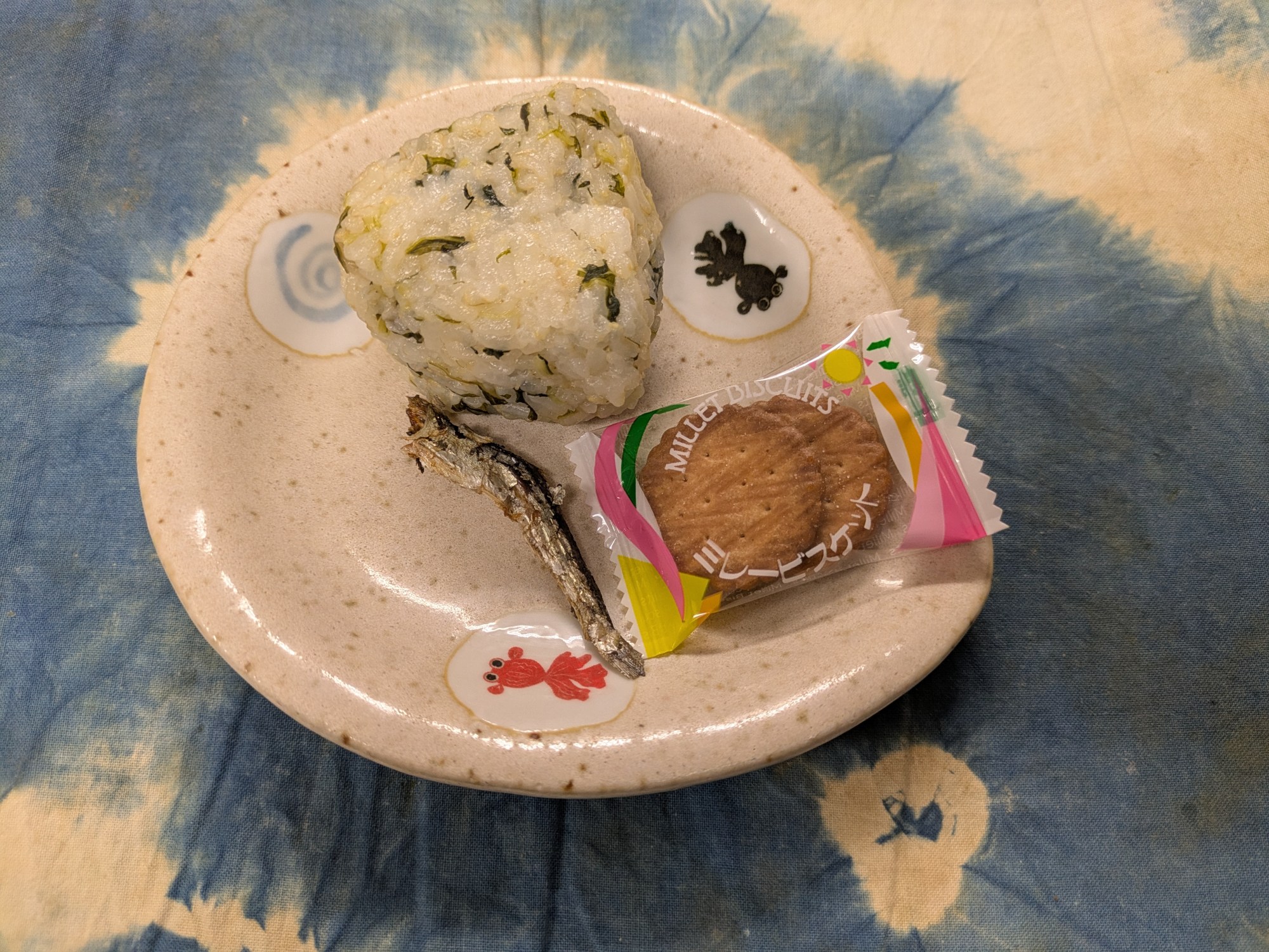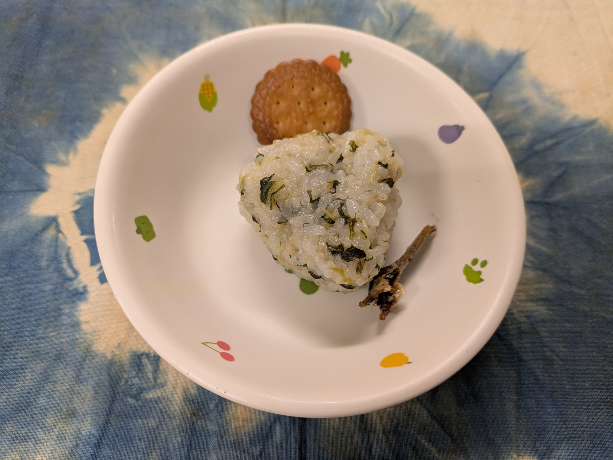 2枚目:【以上児:おやつ】水菜のおにぎり・甘辛じゃこ・お菓子
