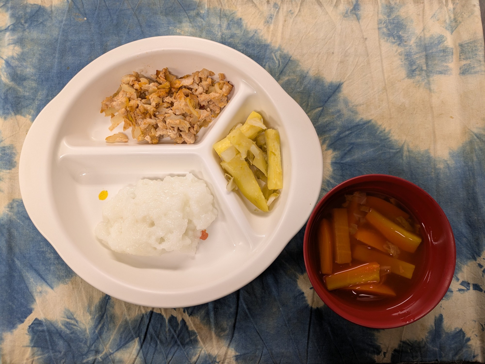 5枚目:【離乳食】豚肉のケチャップ焼き・さつま芋のサラダ・ミネストローネ