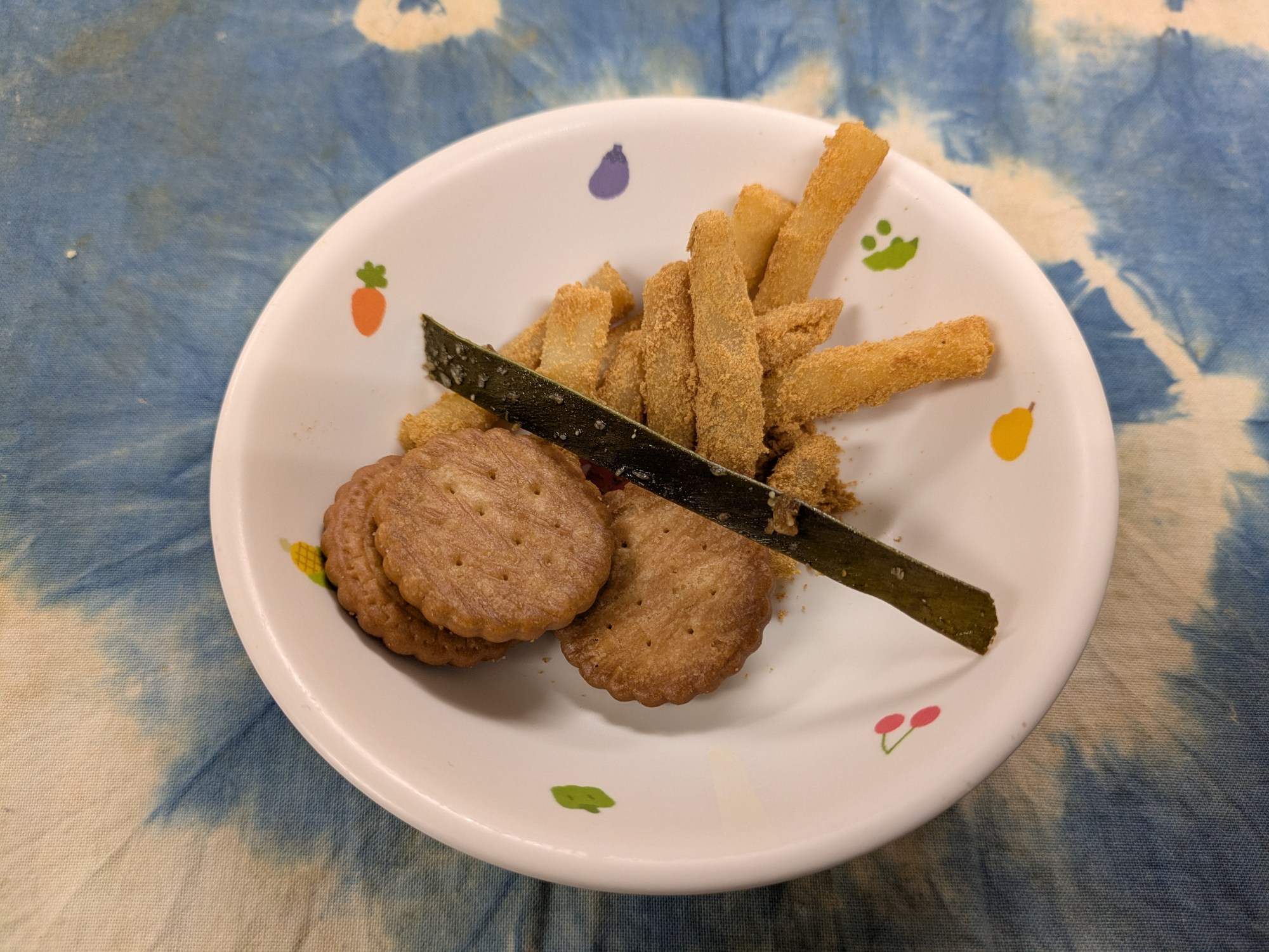 4枚目:【未満児:おやつ】マカロニのきな粉和え・ごまこんぶ・お菓子