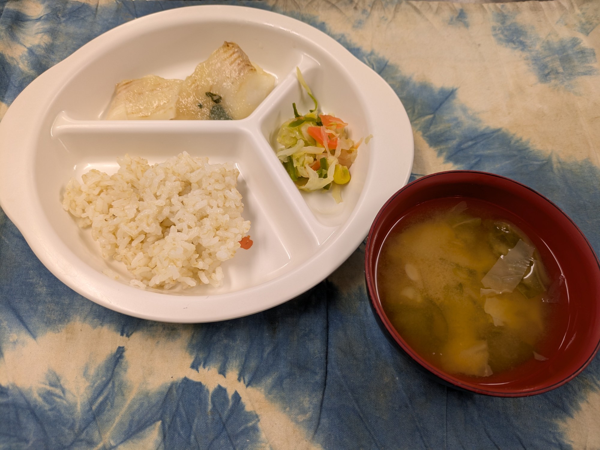 1枚目:【以上児:普通食】カレイのおろしあんかけ・キャベツの和え物・白菜とかぶのみそ汁