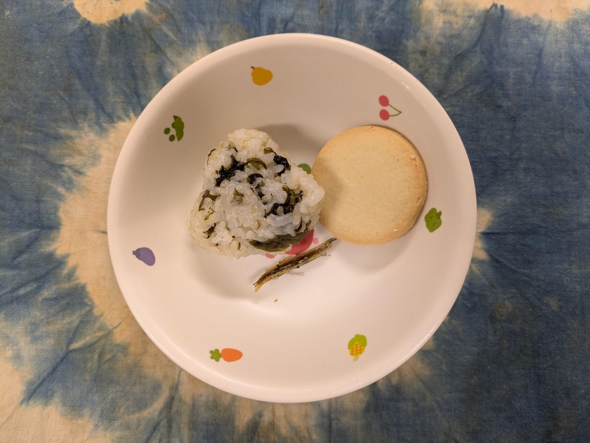 2枚目:【以上児:おやつ】わかめおにぎり・ゆかりじゃこ・お菓子