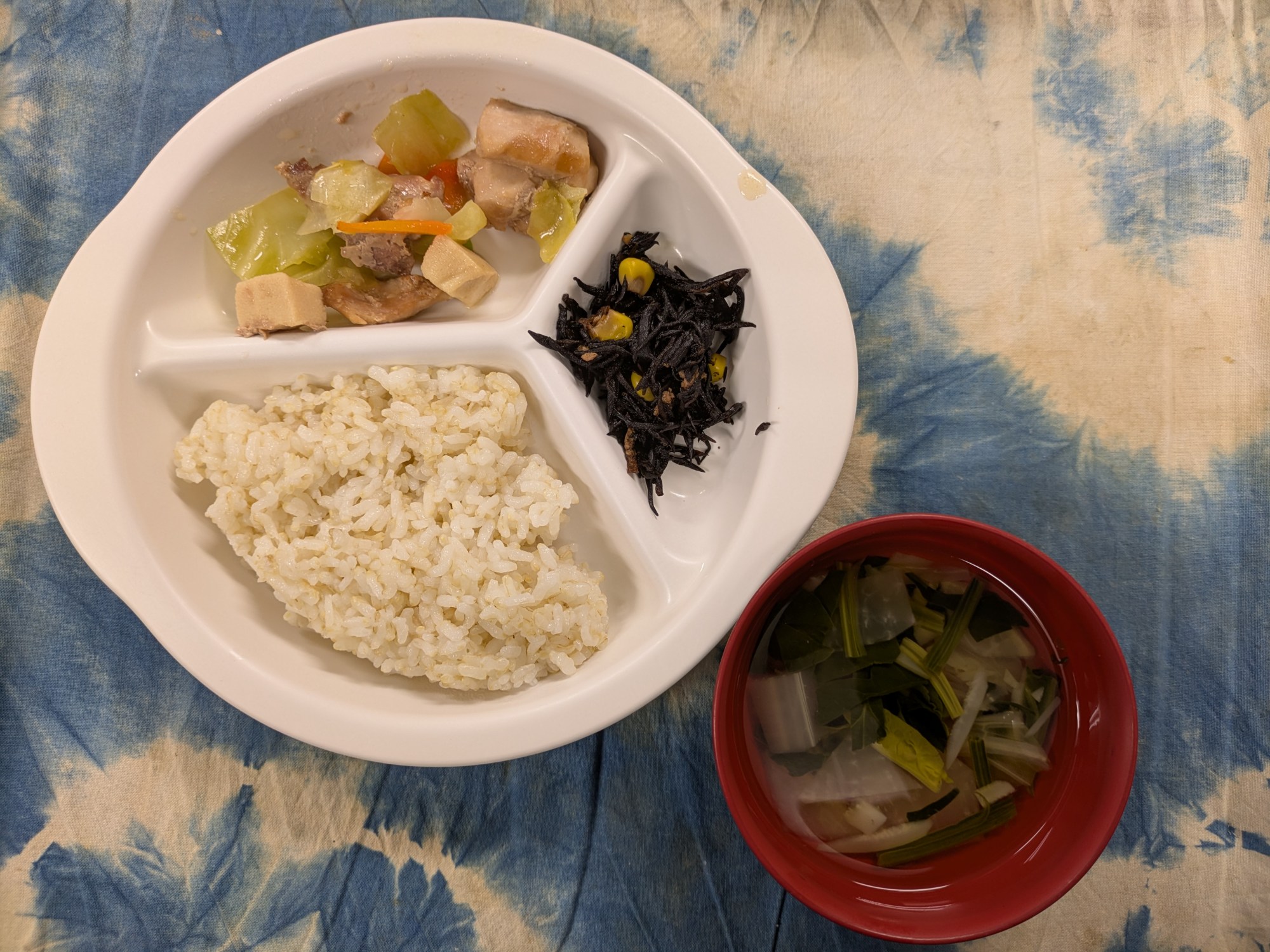 1枚目:【以上児:普通食】鶏肉と高野豆腐の甘辛焼き・ひじきの煮物・大根のすまし汁