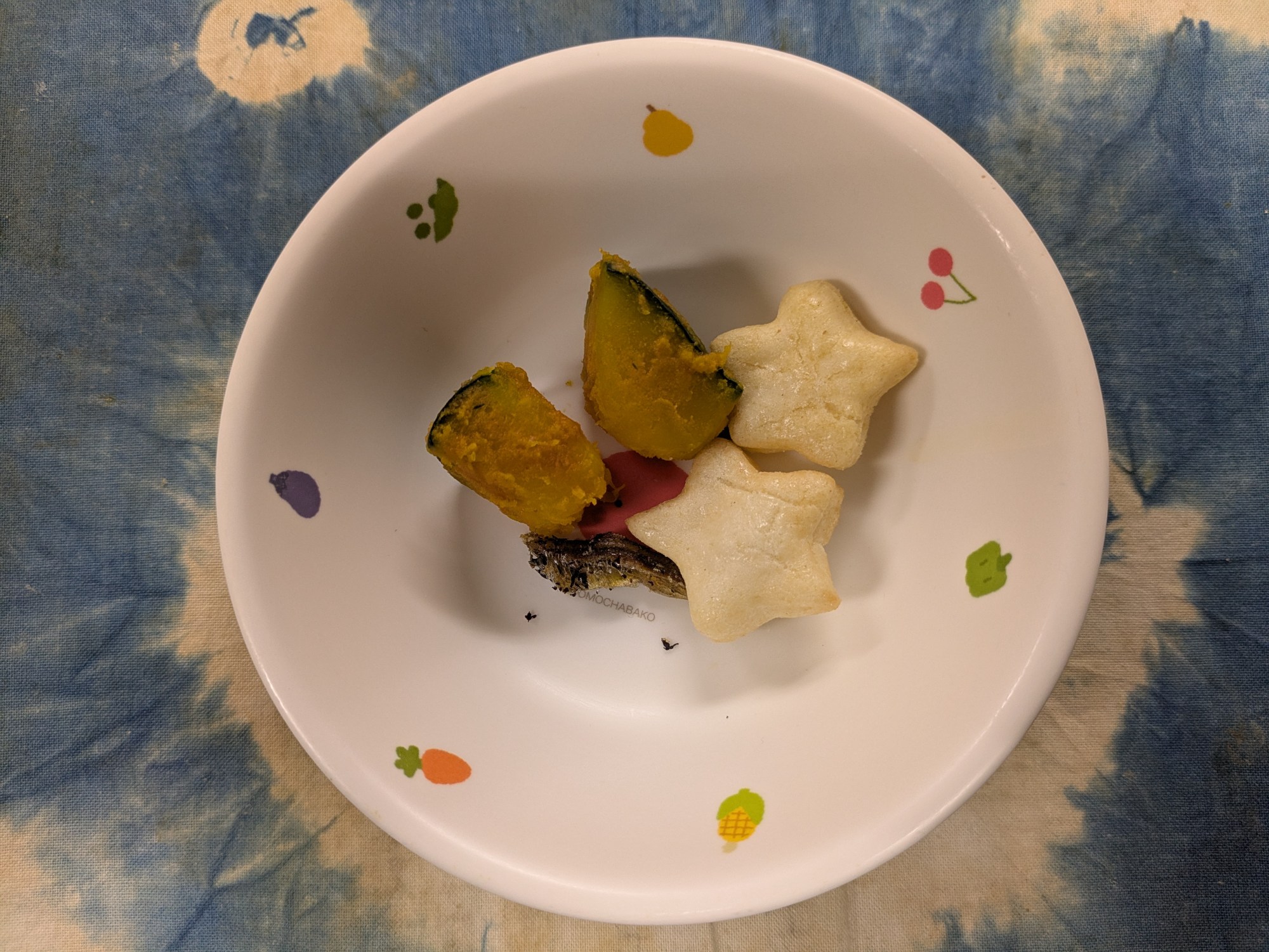 4枚目:【未満児:おやつ】南瓜のきな粉和え・ゆかりじゃこ・お菓子