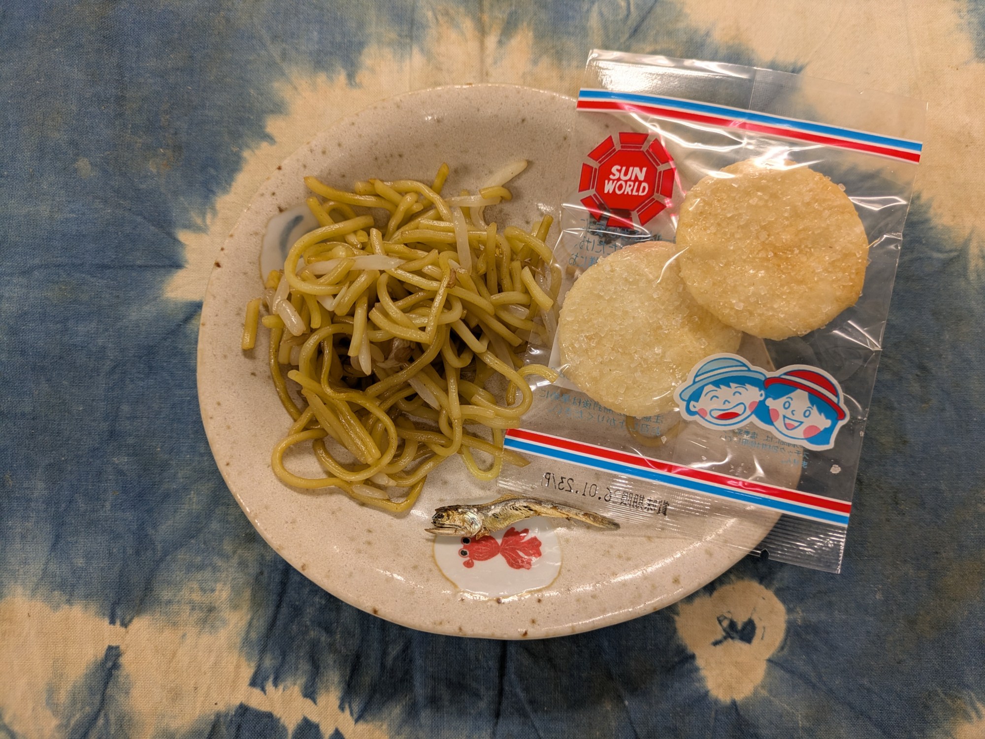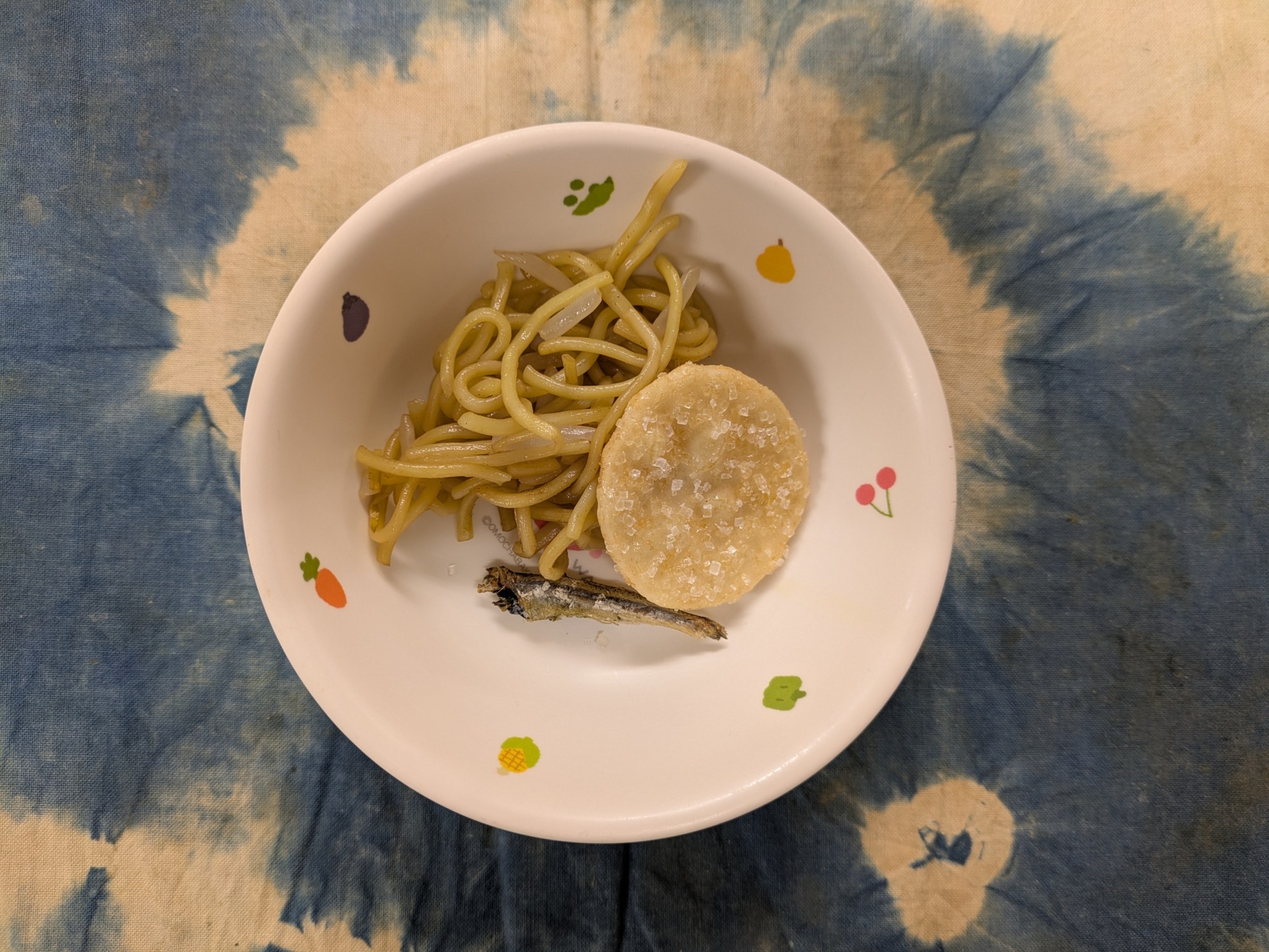 2枚目:【以上児:おやつ】ソース焼きそば・炒りじゃこ・せんべい