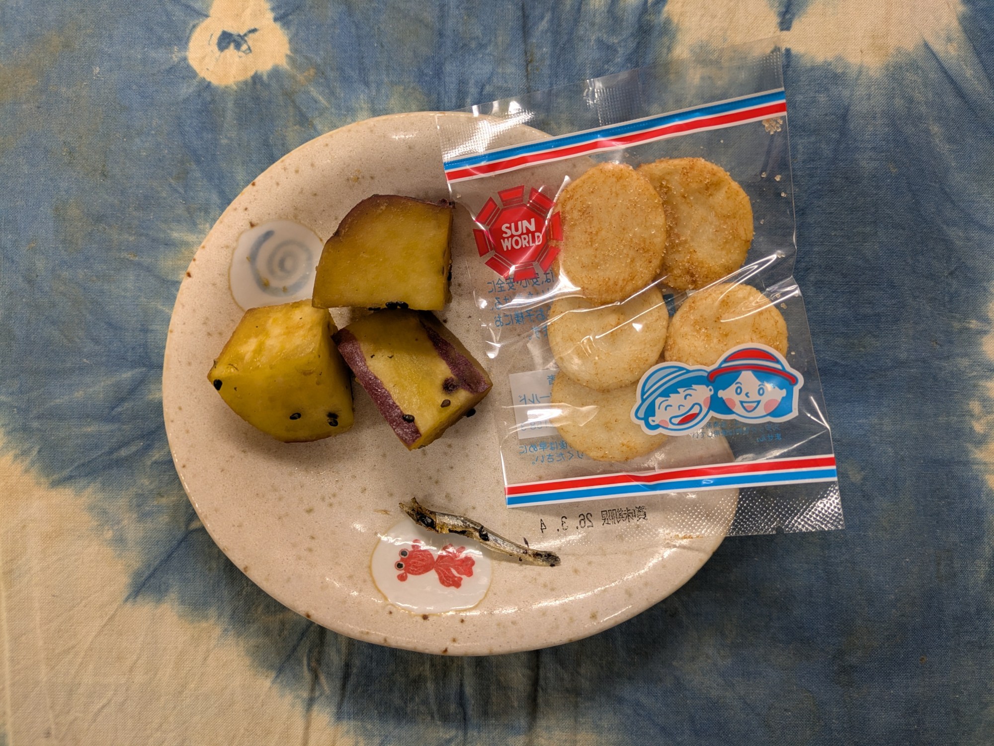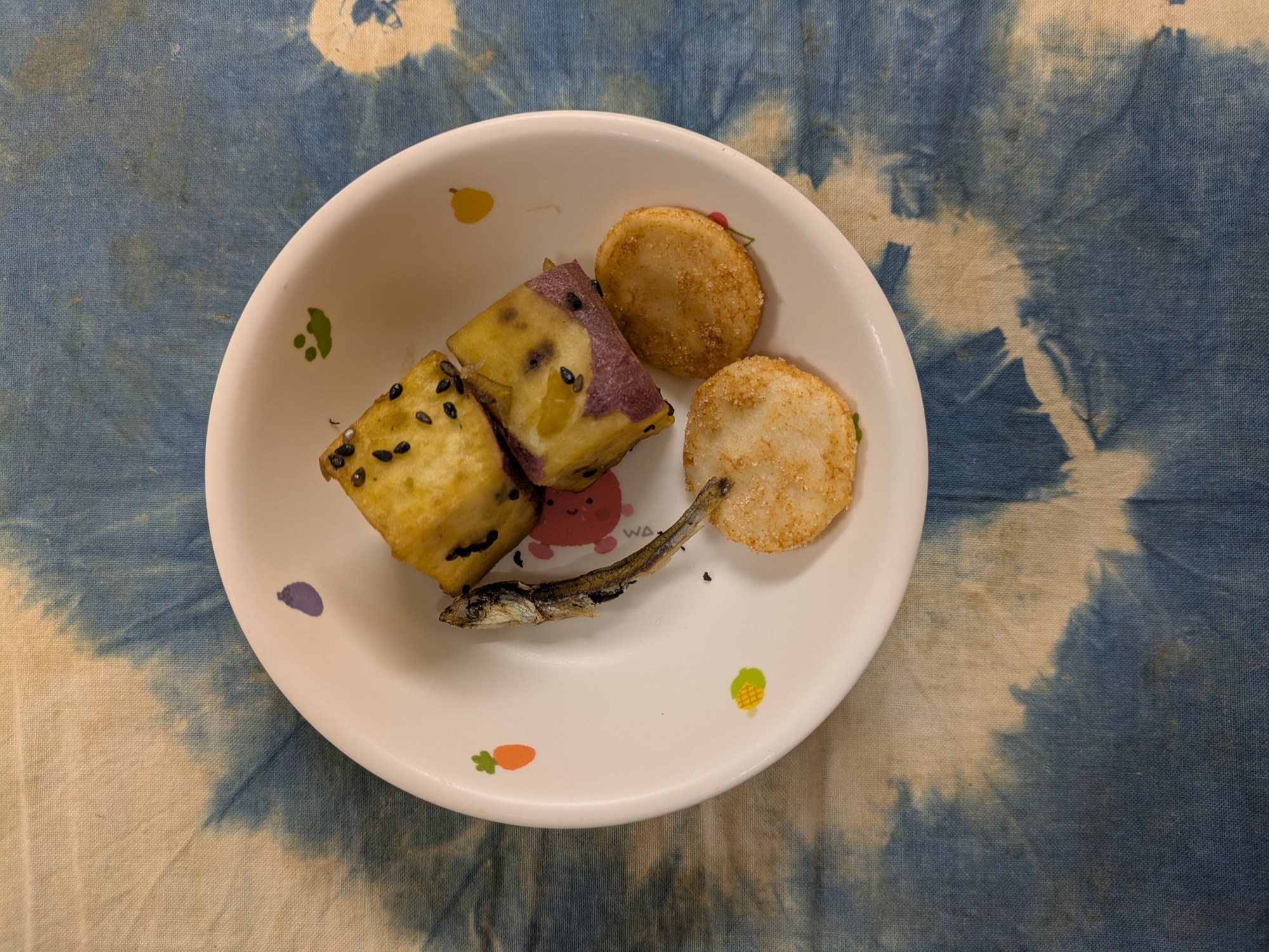 2枚目:【以上児:おやつ】焼き大学芋・ゆかりじゃこ・お菓子