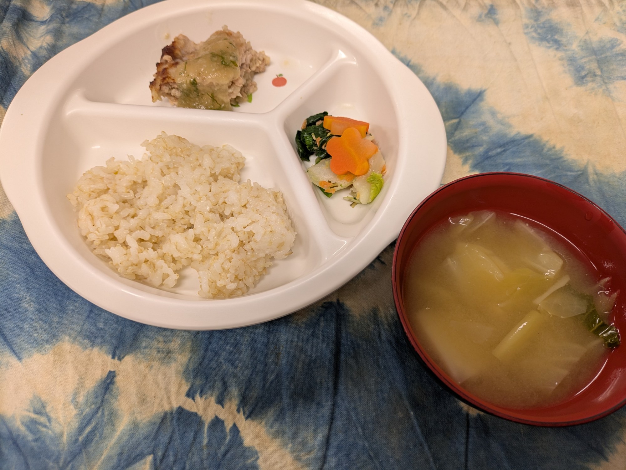 1枚目:【以上児:普通食】おろしポン酢ハンバーグ・白菜とツナの昆布和え・ごまみそ汁