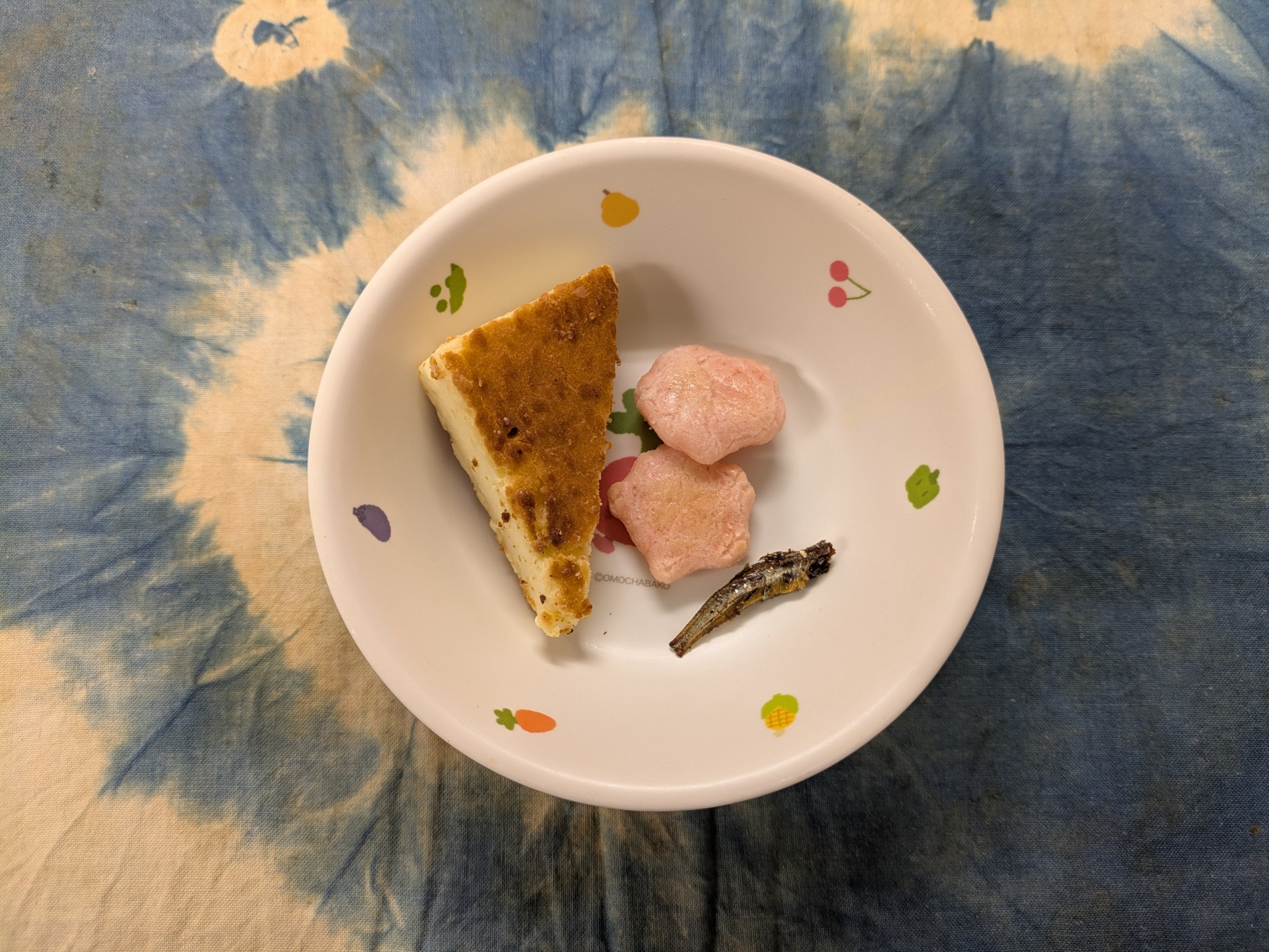 2枚目:【以上児:おやつ】チーズケーキ・甘辛じゃこ・お菓子