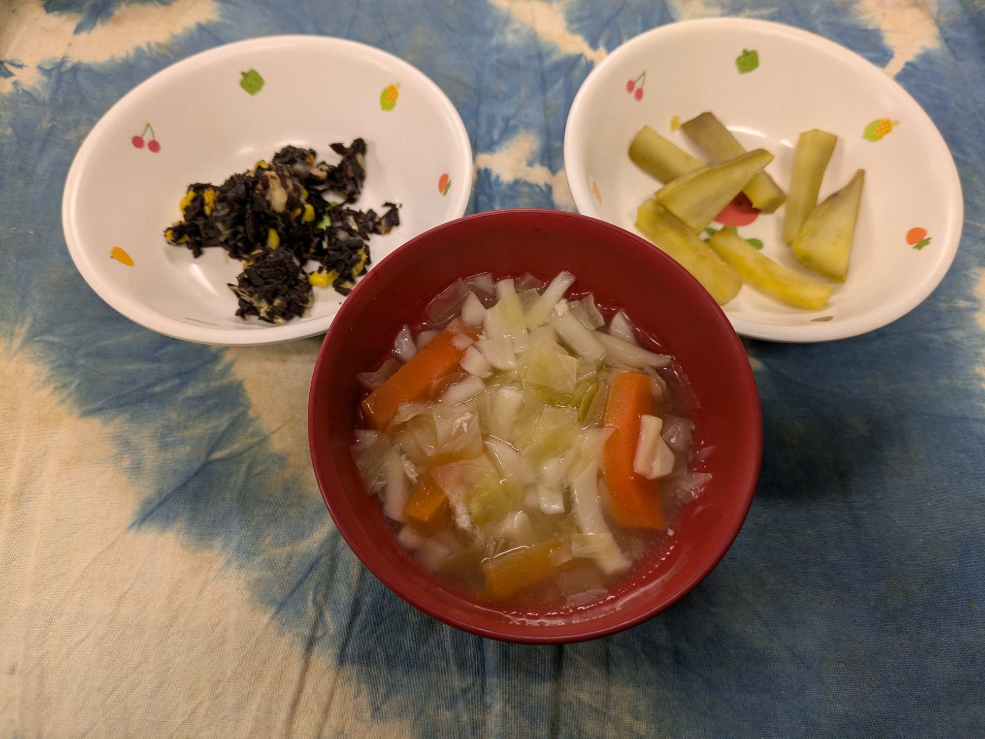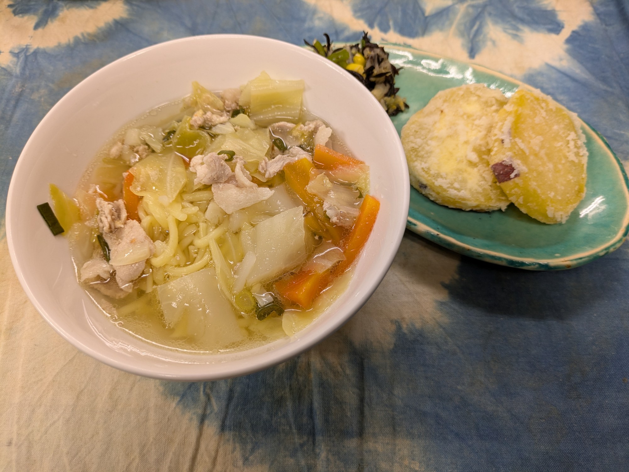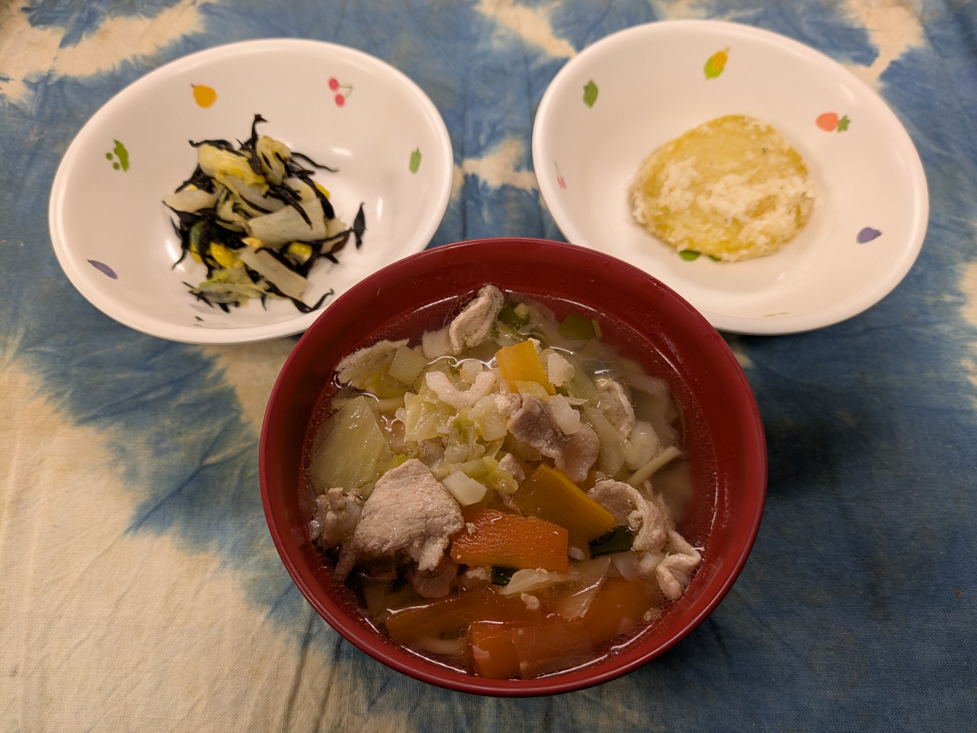 1枚目:【以上児:普通食】塩ラーメン・さつま芋の天ぷら・ひじきの和え物