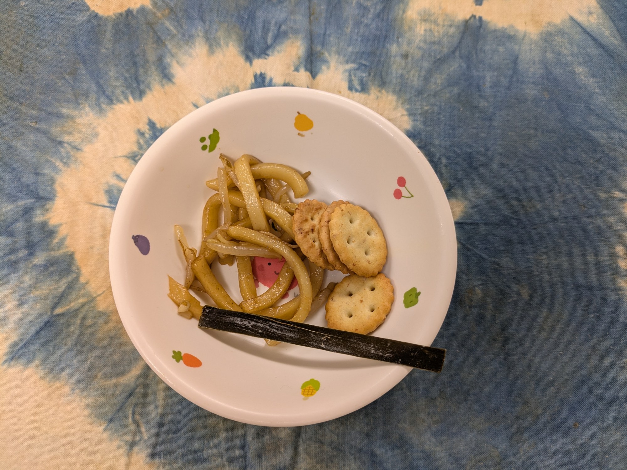 2枚目:【以上児:おやつ】ソース焼きうどん・こんぶ・お菓子