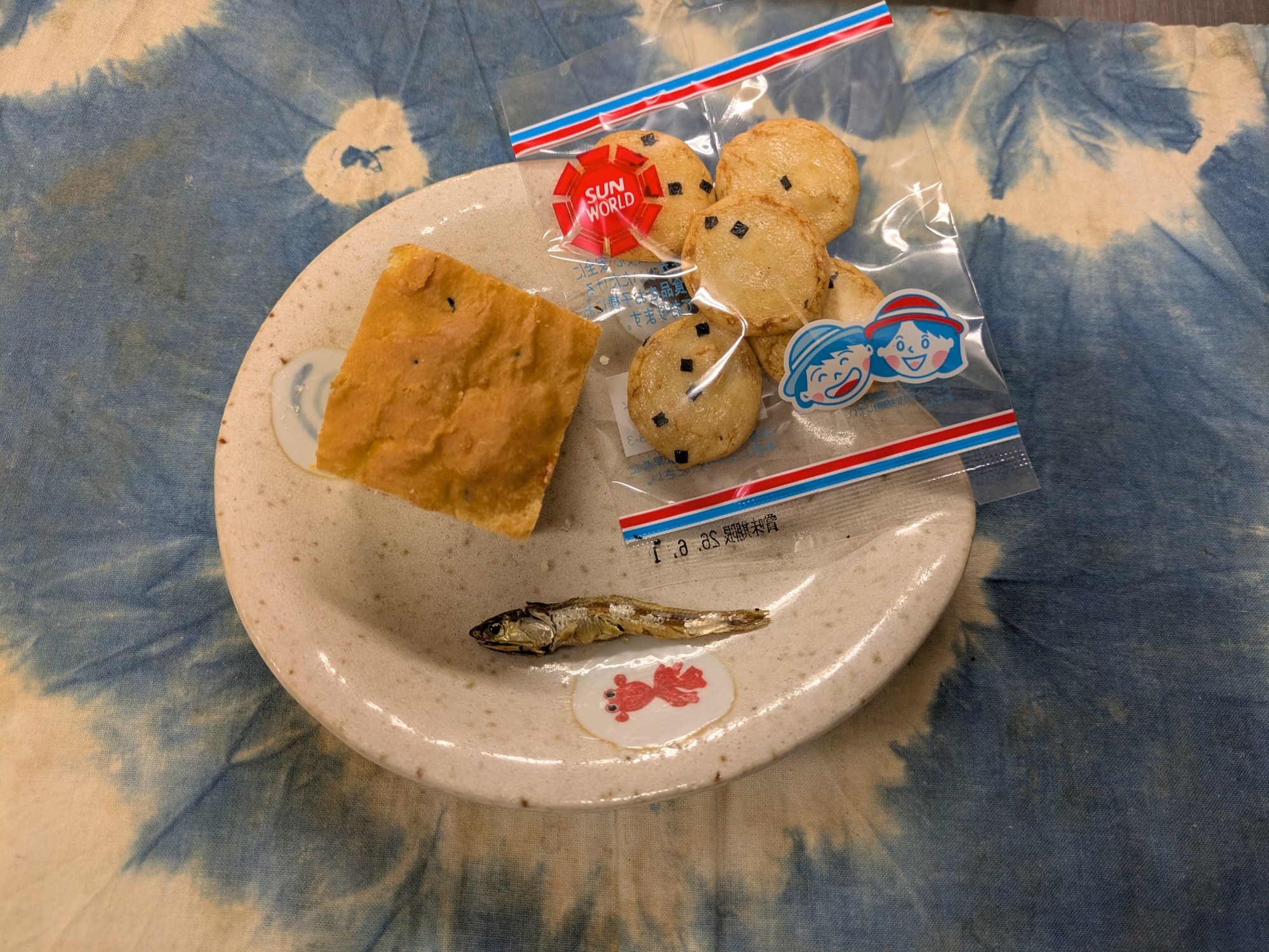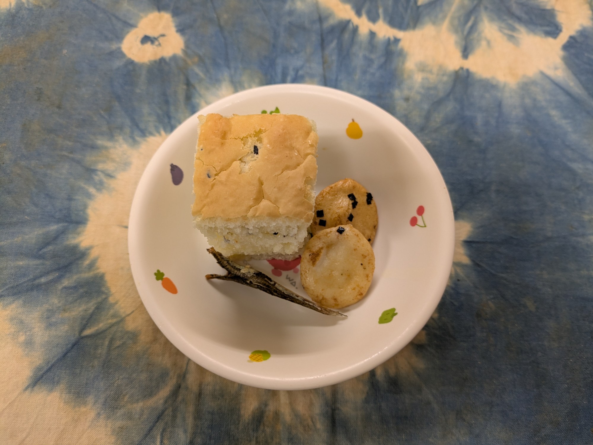 2枚目:【以上児:おやつ】黒ごまチーズのホットケーキ・ゆかりじゃこ・お菓子
